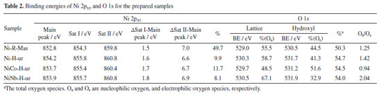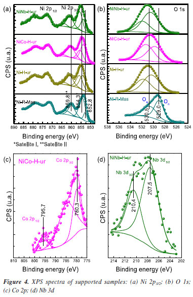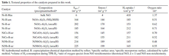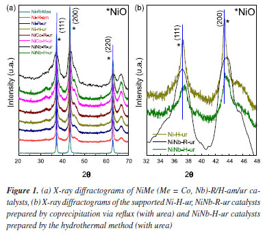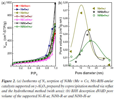 RESULTS AND DISCUSSION X-ray diffraction (XRD) and N2 sorption The X-ray diffraction patterns for the supported samples are shown in Figure 1a. All the diffractograms of samples, no matter the precipitating agent, presented diffraction peaks corresponding to NiO, 2θ = 37.3, 43.4, 63.0, 75.5, and 79.5º (JCPDS 4-835)18 and γ-Al2O3, 2θ = 19.6, 32.6, 37.2, 39.4, 45.7, 60.9, 67.0, and 84.4º (JCPDS 29-63).29 This figure was observed for the samples prepared either by hydrothermal method or coprecipitation method via reflux (Figure 1a). Moreover, no peaks assigned to the presence of Co or Nb were detected, probably due to the presence of possible substitutions of Co for Ni or by the incorporation of Nb5+ that can locate in vacant or interstitial Ni sites. In a larger scale, a shift in the higher angles corresponding to mixed supported samples NiCo-series and NiNb-series (Figure 1b) is observed, related to the compression of the lattice parameter. This reveals that the incorporation of Co or Nb to the lattice of NiO affects the initial crystalline structure, probably influencing the nucleophilic oxygen species present in this catalyst and increasing the pore volume in the mixed catalyst NiNb-H-ur (Figure 2) and with similar picture with NiCo-H-ur.