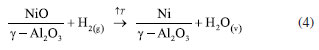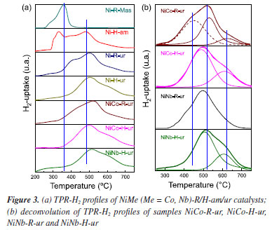 As is shown in the Figure 2a, isotherms of all the catalysts are type-IV corresponding to micro-mesoporous surface for the presence of hysteresis loop with shape type I assigned to the enrichment of cylindrical or conical porous over the surface. The introduction of Co or Nb (5% w/w) onto the support surface allowed to obtain a pore diameter ranging from 10 to 18 nm (BJH method). This is related to the decrease in pore volume observed in the Nb mixed catalysts, NiNb-H-ur and NiNb-R-ur (Figure 2b), compared to single Ni-H-ur, contributing to better saturation of the pores. The main parameters of XRD studies are shown in Table 1S (Supplementary Material). The crystallite sizes could play a significant role in the selectivity toward ethylene according to the literature,1,7,28,30 especially if the crystallite size decreases, which is a factor of enhancement of the selectivity toward ethylene. This can be related to the depression of electrophilic species as the crystallite size is falling down.21,22 However, for the samples Ni-H-ur, NiCo-H-ur, and NiNb-H-ur, the particle size was very similar with a slightly difference in lattice parameter (Table 1S). The lattice parameter of nickel oxide in samples of Ni-H-ur, NiCo-H-ur and NiNb-H-ur was less than the corresponding to bulk NiO no matter the precipitating agent. However, when metals such as Co and Nb are incorporated to NiO, a slight displacement of the peak at 43.62º of (200) plane is observed, which suggests the possible incorporation (partial or total) of metals into the NiO lattice and consequently in the intermetal interaction. Temperature programmed reduction of H2 (TPR-H2) The TPR-H2 profiles of the supported catalysts are shown in Figure 3. For comparison purposes, the results obtained for bulk Ni-R-Mas are also included. The reduction of bulk NiO to Ni metallic is according to the Equation 3. ![]()