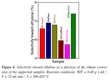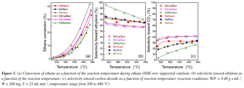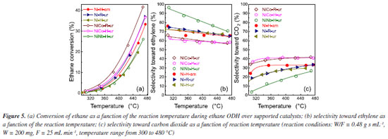 The oxygen species of samples were recalculated to evaluate the effect of preparation condition on the stoichiometry of solid sample. With this aim, the ratio of oxygen species (d) coming from stoichiometric NiO (theoretical NiO) and non-stoichiometric NiO has been quantified from TPR analysis and shown in Table 1. For more details see Supplementary Material. The oxygen ratio of samples Ni-H-ur, NiCo-H-ur and NiNb-H-ur were 0.71, 0.52 and 0.48, respectively (Table 1), so the structure composition of mixed system Ni-Me plays a crucial role in the oxygen distribution in the supported samples. Thus, the lower content of bulk oxygen species, the higher is the expected selectivity toward ethylene. However, this trend is only partially observed in the supported NiO oxide catalyst prepared by the hydrothermal method with ammonium hydroxide (sample Ni-H-am), since the ammonia as a precipitating agent led to lower δ. Catalytic performance for ODH of ethane The catalytic behavior of these catalysts was studied for the ODH of ethane. Firstly, the catalytic activity was evaluated as the variation of the ethane conversion (%) with the temperature of the samples (Figure 5). For comparison purpose, all samples in the Figure 5 are supported with the same surface density (ds = 14.4 at nm-2). As it can be observed, the samples prepared from coprecipitation via reflux were more active than those hydrothermal. Indeed, the sample NiCo-R-ur appeared to be the most active, even more active than Ni-H-ur since the temperature to achieve the 15% of conversion increases from 420 to 435 ºC. The enrichment of oxygen species in NiCo-R-ur respect to Ni-R-ur (Table 1) and the higher H2-consumption in TPR profiles of the mixed sample relative to the single, 211 vs. 153 cm3-STP/g (Table 1) allowed to enhance the activity of the reaction. In contrast, the sample promoted with niobium (NiNb-H-ur) presented a lower activity, probably due to the presence of the less reactive oxygen species in the TPR-H2 experiments (Table 1). The supported samples prepared from hydrothermal compared with coprecipitation via reflux present less reactive oxygen species and, accordingly, a higher reduction temperature is observed (Figure 3b). As a matter of fact, the TPR profiles of NiCo-H-ur and NiNb-H-ur depict a shoulder at higher temperatures meanwhile in NiCo-R-ur a shoulder is present at lower temperatures. On the other hand, the selectivity to the olefin obtained with mixed supported samples is presented in Figure 5b. As it is shown, the selectivity toward ethylene dropped with the reaction temperature and the sample NiNb-H-ur appeared to be the most selective toward ethylene, probably due to the formation of less reducible species (Figure 3b) and the higher value of ratio of On/Oe, as presented in Table 2. For this sample, the selectivity toward CO2, among all the samples, is the lowest (Figure 5c), revealing the formation of selective oxygen species over the surface which led to the partial oxidation of ethane to ethylene.