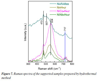 In order to study with a deeper insight of metal atom surroundings, Raman spectroscopy has been employed. As observed in Figure 7, two Raman bands at 460 and 500 cm-1 are identified (Ni-R-Mas), which probably correspond to bulk crystalline NiO.37 In the spectra of Ni-H-ur either the position of the bands or the corresponding intensity changed under the influence of the support attributed to metal-support interaction.38 With the introduction of Co and Nb to NiO, some slightly chemical shifts are observed (for instance at 554 cm-1 for NiCo-H-ur, 507 cm-1 for Ni-R-Mas and 545 cm-1 for NiNb-H-ur), revealing the influence of different chemical surroundings in each case. The peak at 717 cm-1 correspond to stretching oxygen atoms affected by tetrahydric or octahedral of metal atoms (Co or Nb). UV visible-DRS spectroscopy was applied to confirm the atom position. A shift in the band position to lower energy was observed with NiNb-H-ur and Ni-R-ur in relation to NiCo-H-ur and NiCo-R-ur which means a change from tetrahedral to octahedral position39 (Figure 2S).