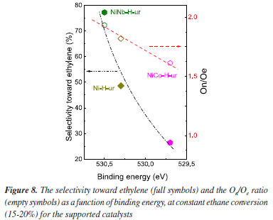 The nature of oxygen was very well distinguished via XPS spectra. In fact, as it is observed in the Figure 8, a direct relation between the On/Oe ratio and the selectivity is clearly observed, revealing different oxygen surroundings in each catalyst. The most selective catalyst, NiNb-H-ur, is the one with the highest value of On/Oe ratio, whereas for NiCo-H-ur and Ni-H-ur, higher concentration of electrophilic oxygen, which are more active for total oxidation reactions, can be observed.