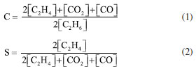EXPERIMENTAL Preparation of catalyst Ni-O and Ni-Me-O (Me = Co, Nb) catalysts supported on γ-Al2O3 (Aldrich, < 50 nm-TEM) were prepared as follows: catalysts were prepared using ammonia (NH3(aq) 0.27 M) or urea (CO(NH2)2 0.27 M) as the precipitating agents. Additionally, these catalysts were prepared by two different methods: (i) hydrothermal (using autoclaves), and (ii) coprecipitation-chemical deposition by reflux. In both methods, the Ni content in the single nickel(II) oxide was 30% w/w, and that of Me (Co, Nb) was 5% w/w. Both, 0.14 M of nickel(II) nitrate, and 0.07 M of CTAB (cetyltrimethylammonium bromide) were mixed in 73 mL of water under stirring for 1 h. Later, to the mixture, two grams of γ-Al2O3 were added and stirred for 1 h. In the case of the hydrothermal preparation, the final solution was added into a flask, and Teflon autoclave, with a volume of 73 mL at 135 ºC for 24 h. In the case of the coprecipitation-chemical deposition by reflux, the conditions were similar, except the temperature that was 120 ºC. For both methods, the solid obtained was dried at 100 ºC for 12 h. Eventually, the solids were calcined at 500 ºC for 4 h with a heating ramp of 5 ºC min-1.28 The supported samples prepared by hydrothermal method and urea as precipitating agent were designated as NiMe-H-ur (Me: Nb, Co). Additionally, Ni-H-am (NiO/γ-Al2O3), using ammonia as precipitating agent, was included for comparison purposes. Samples prepared by coprecipitation-chemical deposition by reflux were nominated as NiMe-R-ur (Me: Nb, Co). The only bulk catalyst was designated as Ni-R-Mas. Catalyst characterization The crystalline phases of the samples was identified by powder X-ray diffraction (XRD). This analysis was performed in a Panalytical Cubix Pro diffractometer, supplied with a graphite monochromator operating at 40 kV and 45 mA using CuKα radiation. The scanning speed was 0.04º per second in the range of 5º to 80º. The identification of the patterns was made using ICDD. The crystallite size was estimated by Scherer's equation using X'Pert HighScore software for the most intense peak at 43.29 ºC. The specific surface area of samples was measured by N2 sorption using Micromeritics Gemini VII equipment. The pre-treatment of the samples was made in 10 mL min-1 of He, at 200 ºC for 2 h. The weight of the sample was around 100 mg, and the relative pressure of N2/He was between 0.05 to 0.985 (total 32 points). The distribution of pore diameter of the catalyst was evaluated using BJH method (Barrett-Joyner-Halenda). The temperature programmed reduction of H2 (TPR-H2) profiles were performed by the Micromeritics Autochem 2910 equipment. The mass of the samples was rough 16 mg. The mixed gas of 10% H2/He was used to reduce the samples. The temperature was linearly increasing from 100 to 800 ºC with a heating ramp of 10 ºC min-1, and the flow rate of 50 mL min-1. The TCD detector was calibrated by the reduction of Ag2O reference. The composition on catalyst surface was determined by XPS analysis using a commercial spectrometer UNI-SPECS UHV with a vacuum of 5 × 10-7 Pa. The Mg Kα line was used (hν = 1254.6 eV) as the ionization source and the pass energy of the analyzer was adjusted to 10 eV. The inelastic noise of the high-resolution Ni 2p3/2, Co 2p3/2, Nb 3d, Al 2p, C 1s and O 1s spectra was subtracted using Shirley's method. Composition was determined by the relative proportions of peak areas corrected for Scofield atomic sensitivity factors to an accuracy of ± 5%. The spectra were deconvolved using a Voigtian-like function, with Gaussian (70%) and Lorentzian (30%) combinations. The width at half height varied between 1.4 and 2.5 eV, and the position of the peaks was determined with an accuracy of ± 0.1 eV using the carbon signal. The chemical environment of metal species in the prepared samples was evaluated by Raman spectroscopy, Horiba Scientific equipment, with a wavelength of 532 nm (green light) and potential of 50%. The bulk composition of metal oxide samples was analyzed by elemental analysis by energy-dispersive X-ray spectroscopy (EDX). The analysis was performed using an EDX720 instrument from Shimadzu. The source was an X-ray tube with an Rh target and the detector was a Si (Li) working at 5-15 kV. Catalyst activity The catalytic tests of prepared samples in the dehydrogenation of ethane were carried out at atmospheric pressure in a fixed bed reactor.22 The activity of ethane and selectivity toward ethylene were evaluated at different reaction conditions at temperatures ranging from 300 to 480 ºC, and a constant W/F ratio of 0.48 g s mL-1. Additionally, the feed mixed gas composition was 5% C2H6/5% O2 balance with helium. The selectivity toward ethylene was studied as a function of conversion for a variable W/F ratio of 0.30-1.92 g s mL-1, at a constant reaction temperature of 420 ºC, to find the conversion as a function of the selectivity toward ethylene for each catalyst. The data was collected using a gas chromatograph Varian GC-3800 with a TCD detector, and two columns as Porapack Q, and molecular sieve 5A. This last column allowed to quantify the concentration of oxygen, and carbon monoxide. The accepted balance of the carbon was 95%. Since the fluxes of feed gas were less than 50 mL min-1, the conversion (C) and selectivity towards ethylene (S) were evaluated as follows: ![]() where [C2H6], [C2H4], [CO] and [CO2] are the molar concentrations of chemicals.