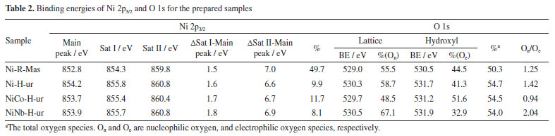 In the supported Ni-H-am and Ni-R-ur catalysts, the reduction to Ni metallic is also observed, but the main peak of reduction is shifted to the right compared with the bulk sample, probably due to the metal-support interaction, according to Equation 4. This shifting was also observed in other supported samples (Ni-H-ur, NiCo-H-ur and NiNb-H-ur). ![]() A redistribution of reducible species in all supported samples is clearly observed in the Figure 3a. For the single Ni-H-ur sample, compared to the Ni-R-ur sample, the formation of reducible species occurs at higher temperatures, even when compared to the single Ni-H-am sample. The introduction of Co and Nb into the NiO framework further increased the reduction temperatures, probably due to Ni-synergy effects and metal-support interactions. In addition, differences are also observed in mixed supported samples depending on the preparation (Figure 3b), that shows the deconvolution display of TRP profile. For instance, in the catalyst prepared by reflux (NiCo-R-ur), three peaks of reducible deconvolution peaks can be clearly observed, whereas in the catalyst prepared hydrothermally (NiCo-H-ur) only two peaks are detected, but with a major formation of more reducible species. The mixed sample NiNb-H-ur (Figure 3b) presents a TPR pattern very similar to NiCo-H-ur. The sample prepared from reflux NiNb-R-ur presents only one peak in deconvolution without the formation of a peak at high temperatures, probably due to the formation of one oxygen species. The particular characteristics in the TPR profiles of both NiNb-H-ur and NiCo-H-ur will be further discussed in the XPS analysis and during the catalytic reaction test. Referring to H2-uptake, the Co- and Nb-doped samples consumed less hydrogen than supported single NiO (Ni-H-ur). Thus, the hydrogen consumption for the NiCo-H-ur sample was 157 and NiNb-H-ur 145 cm3-STP/g (STP: standard conditions of T and P) compared with supported NiO 212 cm3-STP/g (Table 1). This is possibly assigned to the lower extent of oxidation of Ni species in the mixed samples. X-ray photoelectronic spectroscopy (XPS) The spectra of O 1s for all of the samples (Figure 4b) show 2 types of oxygen: nucleophilic oxygen (On) species corresponding to O2- (lattice oxygen), and electrophilic oxygen (Oe) species corresponding to O2-, O- or hydroxyl species.31,32 The nature of the oxygen species has been related to the selectivity towards ethylene, in a way that the predominance of nucleophilic species are usually linked to a higher formation of partial oxidation or dehydrogenation products, such as ethylene. For these samples, the higher is the O1s binding energy (BE), the higher selectivity toward ethylene is expected.22 In fact, the maximum value of BE of O 1s (530.5 eV) is achieved by the sample NiNb-H-ur, which is the one that presents the highest selectivity to ethylene, as it will be shown later. On the other hand, the relationship between On and Oe species (On/Oe) shows an interesting behavior in Nb-containing mixed sample with a magnitude of 2.04, which is the maximum obtained by all the catalysts studied in this work. This is probably due to the incorporation of Nb atoms in the NiO framework, as observed in the XRD and TPR analysis.