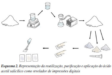 Além dos quatro tipos fundamentais de desenhos papilares nas impressões digitais (arco, presilha, verticilo e composto), os detalhes específicos das cristas das impressões digitais são compostos por uma série de minúcias ou pontos característicos como pode ser observado na Figura 1b. Essas minúcias são perturbações fisiológicas naturais nas cristas que são usadas para a identificação e comparação de impressões digitais.10 As impressões digitais, quando detectadas em locais de crime, são consideradas como evidências circunstanciais e incontestáveis em investigações forenses e para a justiça criminal, pois as impressões digitais possuem características como unicidade, perenidade e imutabilidade.11 As impressões digitais latentes são amplamente encontradas em locais de crime, porém para sua identificação é necessária a utilização de alguma técnica de visualização. Existem diversas técnicas para revelação de impressões digitais latentes e a mais amplamente empregada é a técnica de revelação por pó revelador devido à sua simplicidade e eficácia, essa técnica se baseia na aderência mecânica ou física dos pós aos componentes úmidos e oleosos dos resíduos das impressões digitais.12-14 Nesse sentido, o trabalho tem como objetivo usar AAS purificado para formulação de pós reveladores juntamente com a lignina e o azul de metileno. A lignina foi escolhida por ser um corante renovável, derivado de matrizes que são descartadas na indústria como a casca de arroz. Além disso, sua eficácia na revelação de impressões latentes foi previamente comprovada em estudos científicos já existentes.15 A escolha do azul de metileno como componente se deu ao seu baixo custo e à necessidade de disponibilizar pós reveladores de diversas tonalidades, visando assegurar a eficácia na revelação de impressões digitais em uma ampla variedade de superfícies coloridas.15-17 Além disso, existem graduações e pós-graduações que dispõem do ensino de papiloscopia, que é a ciência que estuda as impressões digitais para fins de identificação humana. O ácido acetilsalicílico é uma substância amplamente utilizada na medicina devido às suas propriedades analgésicas e anti-inflamatórias. No entanto, o seu potencial para revelação de impressões digitas não havia sido relatado. Nesse sentido, o trabalho visa avaliar a viabilidade desta aplicação alternativa como ilustrado no Esquema 2 e, ao mesmo tempo, promover a conscientização sobre a importância da reciclagem de produtos químicos em ambientes educacionais e de pesquisa.