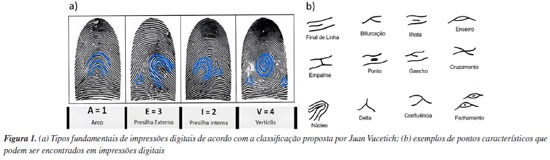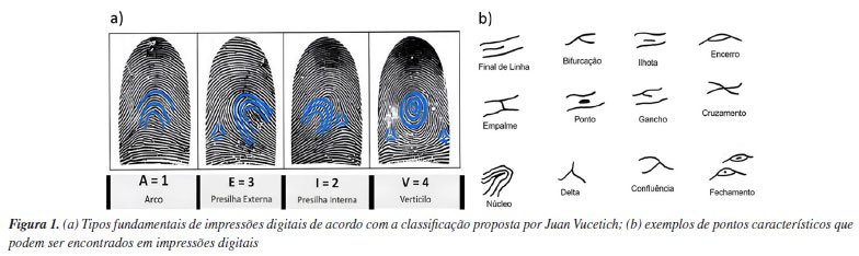 No entanto, é comum que o produto sintetizado seja descartado após o término da aula, o que levanta questões sobre a otimização do uso de recursos e a minimização de resíduos químicos. Este trabalho surge do princípio de prevenção da química verde que consiste em evitar a produção de um resíduo químico, ressignificando assim um produto químico puro e transformando-o em um material multidisciplinar, purificando-o por recristalização e investigando seu potencial uso em uma aplicação prática e forense: a formulação de pós reveladores de impressões digitais.8 As impressões digitais desempenham um papel importante na perícia forense e podem ser usadas para identificar indivíduos com uma alta probabilidade de precisão.9 Juan Vucetich foi um pioneiro na ciência das impressões digitais e é conhecido por ter desenvolvido um sistema de classificação de impressões digitais em seu livro “Dactiloscopia Comparada”.10 Em 1892, Juan Vucetich utilizou suas habilidades e conhecimentos para resolver um caso criminal importante na Argentina, uma vez que as impressões digitais foram fundamentais para identificar o culpado. Em seu sistema de classificação de impressões digitais Vucetich subdividiu as impressões digitais de acordo com a posição e direção de conjuntos de cristas assim como a presença ou ausência de delta obtendo quatro tipos fundamentais de impressões digitais sendo eles o arco, a presilha interna, a presilha externa e o verticilo (Figura 1a).9,10