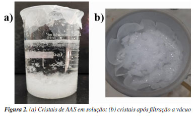 RESULTADOS E DISCUSSÃO A partir do ácido acetilsalicílico proveniente das aulas de orgânica experimental foi realizada uma purificação por meio de recristalização. Após o processo de recristalização observou-se a formação de cristais na solução (Figura 2a), os mesmos foram separados por filtração a vácuo como ilustrado na Figura 2.