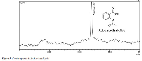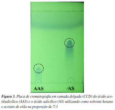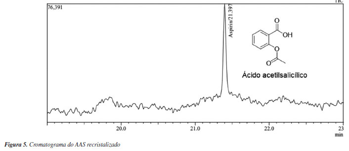 Primeiramente, após a purificação foi realizada a CCD em comparação entre o ácido salicílico que é utilizado como precursor na síntese do AAS, e o produto purificado. A Figura 3 representa a CCD obtida, na qual é possível observar o fator de retenção do AAS de 0,2 e para o AS de 0,55 no solvente utilizado (hexano e acetato de etila 7:3). Ambos compostos apresentam caráter polar, interagindo predominantemente com o acetato de etila da fase móvel. O hexano tem a função de reduzir esta interação, fazendo com que ocorra uma melhor separação dos compostos. Nota-se que a mancha do ácido acetilsalicílico possui uma menor interação com a fase móvel quando comparado à mancha do ácido salicílico. Isso ocorre porque o grupo fenólico presente no AS possui maior polaridade que o grupo éster do AAS.23,24 Dessa forma, podemos aferir que todo o reagente foi consumido e consequentemente o produto foi formado. Além disso, é possível observar apenas uma mancha no AAS, o que também indica que o produto está puro, sendo essa informação confirmada pela cromatografia gasosa.