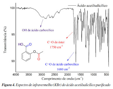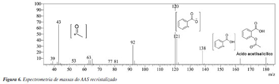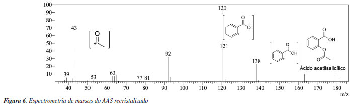 A caracterização do AAS foi realizada por espectrometria de infravermelho e cromatografia acoplada a espectrometria de massas como ilustrado nas Figuras 4, 5 e 6 respectivamente. No espectro de infravermelho (Figura 4) é possível observar bandas características do AAS, bem como a banda de hidroxila (OH) de ácidos carboxílicos em 3100 cm-1, e as bandas de carbonila (C=O) de éster e ácido carboxílico respectivamente em 1750 e 1680 cm-1. Cabe salientar que se não houvesse ocorrido a formação do produto, não seria possível a visualização da banda referente a C=O de éster. Além disso, o cromatograma (Figura 5) apresenta um único pico no tempo de retenção 21,397 min, o que indica que o composto em questão está puro. Na Figura 6, é possível observar o espectro de massas que apresenta o padrão de fragmentação da estrutura química, de modo que a razão massa carga 180 m/z refere-se ao íon molecular do AAS. As fragmentações em 121 e 120 m/z ([C7H5O2]+ e [C7H4O2]+), correspondem à perda característica do grupamento acetila, já a fragmentação em 43 m/z ([C2H3O]+), à perda e o aparecimento da carbonila.25