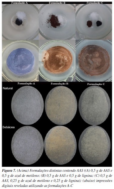 Após a confirmação da pureza do AAS, foram realizadas três formulações distintas contendo AAS, lignina e azul de metileno como representado na Figura 7. Por meio da adição desses pigmentos, é possível observar que a coloração final das formulações A-C apresentou cor azul claro, laranja e marrom respectivamente. Essas diferentes colorações são importantes, pois as impressões digitais podem ser encontradas em diferentes objetos que vão apresentar diferentes cores.26 Com isso, é indicada a utilização do pó que apresenta o melhor contraste de acordo com o substrato.