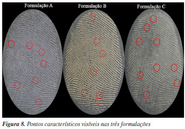 Feitas as formulações, os pós foram aplicados em impressões digitais latentes naturais e sebáceas de 3 doadores. A Figura 7 também apresenta as imagens das impressões digitais reveladas utilizando as formulações A-C. A partir das imagens é possível observar que todas as formulações foram promissoras na revelação das impressões digitais demonstrando imagens das papilas dérmicas dos doadores de forma clara, o que permitiria que fossem utilizadas para fins de identificação humana. Cabe ressaltar que a formulação B com lignina foi mais eficiente e isso pode se dar pela lignina utilizada ter alta concentração de SiO2, o que permite uma boa capacidade de interação do material com as secreções deixadas pelas impressões digitais e não ao substrato.15 Vale ressaltar que os pós utilizados atualmente tanto para perícia, pela polícia científica, como para ensino em cursos de graduação e pós-graduação em áreas relacionadas à química forense, são adquiridos via importação, o que acaba elevando o custo destes materiais, uma vez que não existe um produto nacional. Dessa forma, a reutilização desses compostos obtidos das aulas práticas de orgânica experimental e que seriam descartados, constituem uma solução sustentável e de menor custo para a universidade proporcionar ensino nessa área. A Figura 8 demonstra impressões digitais reveladas com as três formulações, onde é possível observar o tipo fundamental de presilha externa e alguns pontos característicos. Esses detalhes das cristas e as minúcias são o que provavelmente identificaria um suposto indivíduo em uma cena de crime.11