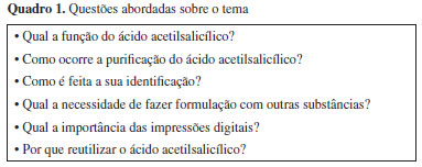 Finalmente, é importante destacar que, por meio deste experimento, é viável introduzir aos estudantes conceitos relacionados à síntese orgânica, cromatografia, interpretação de resultados analíticos e ciências forenses, com foco na papiloscopia. A utilização dessas substâncias como agentes reveladores de impressões digitais latentes com propósitos educacionais tem como principal objetivo a ampliação da aprendizagem, estabelecendo conexões claras entre a teoria e a prática. Isso promove a compreensão da química aplicada e desperta o interesse dos alunos nas aulas, especialmente porque a química forense é uma área em crescimento.27,28 Além disso, esses compostos são facilmente obtidos, possuem custos reduzidos em comparação com os produtos recomendados para revelação de impressões digitais latentes e são caracterizados por sua baixa toxicidade, tornando seu uso seguro em laboratórios para os estudantes. O Quadro 1 resume as questões abordadas sobre o tema.