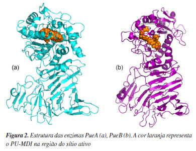 METODOLOGIA Estruturas Os modelos tridimensionais (3D) da PueA e da PueB foram determinados por modelagem comparativa. Essa técnica é baseada na ideia de que as estruturas 3D e a função de duas proteínas ou enzimas são provavelmente semelhantes se suas sequências primárias tiverem pelo menos 25% de identidade.19 Dessa forma, é possível determinar teoricamente as estruturas 3D de enzimas, se houver uma estrutura 3D de uma enzima homóloga já disponível em bancos de dados como o PDB (do inglês, Protein Data Bank).20 Também é possível notar que as estruturas internas, por exemplo: α-hélices e folhas-β, são geralmente conservadas em enzimas homólogas além de estruturas externas, como loops.21,22 As sequências primárias das enzimas PueA e PueB foram obtidas do GenBank, o banco de dados de sequência genética da NCBI (do inglês, National Center of Biotechnology Information).23 A busca de enzimas homólogas a serem usadas como modelos na modelagem por homologia foi realizada pelo servidor BLAST (Basic Local Alignment Search Tool) usando o algoritmo BLASTp.23 Os múltiplos alinhamentos foram obtidos usando o algoritmo Muscle24,25 no programa AliView.26 A partir do melhor alinhamento entre estruturas de modelo e sequências de destino, o Modeller 9.827 foi usado para construir os modelos das enzimas por meio do método de restrições espaciais. O melhor modelo para cada enzima foi selecionado com base nos resultados do PROCHECK28 e Verify-3D.29 A análise de sequências para a determinação dos domínios e locais funcionais foi realizada pelo PROSITE.30,31 A estrutura do monômero de PU-MDI (Figura 1) foi construída no Gauss View32 e otimizada no programa Gaussian 0933 usando o funcional B3LYP34 e as funções de base 6-31G(d,p).35 Após a otimização verificou-se a ausência de frequências negativas indicando que aquela era a geometria molecular de menor energia. Também se otimizou o monômero com solvente implícito, não observando diferenças significativas na energia das duas estruturas. Além disso, foi analisado os estados de protonação em pH neutro usando Marvin Sketch 19.836 o qual é precisamente aquele mostrado na Figura 1. Ainda, este padrão contribui como 100% até o pH 8,40 atingindo 99% em pH 10,80 e 90% em pH 11,80. Somente acima do pH 12,00 que outras formas, como o NH desprotonado, passam a cumprir um papel. Tanto a estrutura das enzimas (Figura 2) quanto a do monômero (Figura 1) foram construídas em trabalhos anteriores16,17 do nosso grupo de pesquisa.