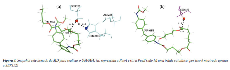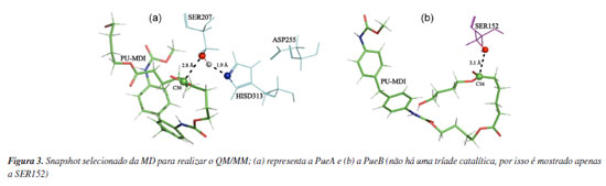 Os dois sistemas foram, primeiramente, relaxados por meio do algoritmo steepest descent com um máximo de 50,000 passos, depois sujeitos a equilibração nos ensembles NVT e NPT por 100 ps em cada um. Por fim a MD de 500 ns (nanossegundos), em triplicata, no ensemble NPT com temperatura de 310 K mantida constante pelo termostato V-rescale40 e a pressão controlada pelo barostato Parrinello-Rahman.41 Além disso, o tempo do passo foi de 2 fs (fentossegundos) e as interações de longo alcance foram calculadas com o algoritmo PME (Particle-Mesh Ewald) usando um corte de 10 Å. Ademais, o modelo de água usado foi o TIP3P42 em concentração fisiológica (0,154 mol L-1 de NaCl), o campo de força escolhido para descrever o sistema foi o AMBER03.43 Utilizou-se de forma análoga, esse procedimento, para a simulação do PU-MDI livre. QM/MM Essa abordagem permite estudar o mecanismo de reação por meio da mecânica quântica, QM (do inglês, quantum mechanics) enquanto os efeitos do meio circundante são modelados usando mecânica molecular, MM (do inglês, molecular mechanics). Com esse objetivo selecionou-se a configuração mais adequada a partir dos frames da trajetória da MD conforme apresentado na Figura 3. No caso do complexo PueA escolheu-se um frame com a menor distância entre o hidrogênio (HG) da SER207 e o nitrogênio (NE2) da HISD313 ao mesmo passo da menor distância do oxigênio (OG) da SER207 e do carbono (C30) do PU-MDI. Já no complexo PueB em que há apenas um resíduo catalítico procurou-se o frame de menor distância entre o oxigênio (OG) da SER152 e o carbono (C16) do PU-MDI, a nomenclatura desses átomos está detalhada nas Figuras 6S e 7S (Material Suplementar). Esse critério de seleção dos snapshots da MD em que envolvem as menores distâncias dos átomos no ataque nucleofílico foi baseado em outro trabalho44 com mecanismo reacional semelhante. Por outro lado, também se selecionou, entretanto, de forma aleatória um frame da MD do ligante livre em meio aquoso para comparar as barreiras energéticas dos mecanismos com e sem catalisador.