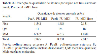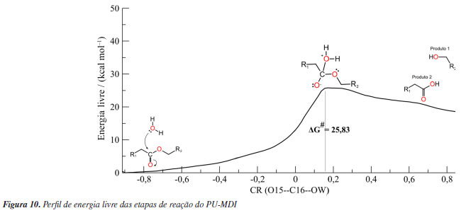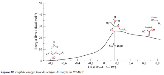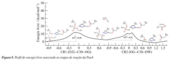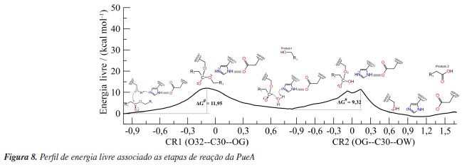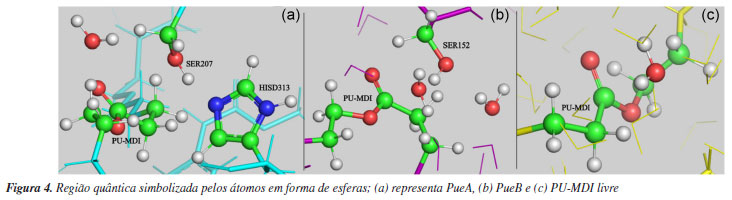 Diante disso, nota-se que a barreira energética da hidrólise sem catalisador é maior. Ou seja, tanto o mecanismo da PueA quanto o da PueB diminuem a energia de ativação indicando que podem biocatalisar a degradação do PU-MDI. Ainda se observou que a barreira energética da PueA é 3,15 kcal mol-1 menor do que a da PueB corroborando com os resultados experimentais do Crookes-Goodson e colaboradores.18