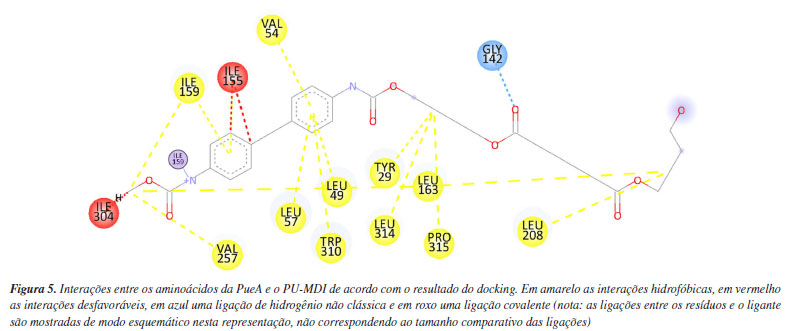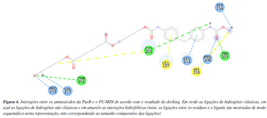 Por outro lado, o resultado do docking da PueB (Figura 6) mostrou mais interações polares, sendo três ligações de hidrogênio clássicas e cinco não clássicas. Também se formaram interações apolares do tipo alquil e pi-alquil. Dessa forma, ao se comparar as duas enzimas quanto às interações com o PU-MDI, percebe-se que a PueA embora tenha interações desfavoráveis, há um número maior de resíduos interagindo com o substrato. Ademais, em termos numéricos a função score da PueA e da PueB foram, respectivamente, -10,743 e -9,587 kcal mol-1. Ou seja, o PU-MDI, aparentemente, se ajusta melhor em um sítio ativo mais hidrofóbico (como da PueA) do que hidrofílico (como da PueB).