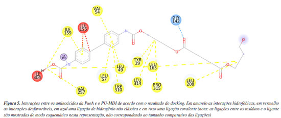 RESULTADOS E DISCUSSÃO O docking do PU-MDI na PueA apresentou as seguintes interações com o ligante, conforme Figura 5. Nesse sentido, observa-se que a maioria das interações foram hidrofóbicas alquil, pi-alquil e entre anéis aromáticos, seguido de uma interação covalente e uma ligação de hidrogênio não clássica entre o oxigênio da carbonila do PU-MDI e o hidrogênio ligado covalentemente ao carbono (sp3) da GLY142. Essa interação intermolecular é considerada um pouco mais fraca do que as ligações de hidrogênio clássicas conforme estudado por Johnston e Cheong.52 Além disso, nota-se três interações desfavoráveis com os resíduos ILE155 e ILE304, possivelmente, causadas por sobreposições espaciais ou colisões estéricas.