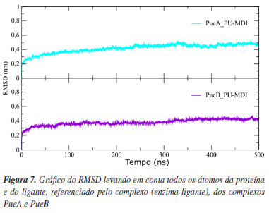 As simulações MD foram analisadas do ponto de vista da estabilidade, flexibilidade (Figura 4S) e interação (Figura 5S) com o ligante. Dessa maneira, a partir do gráfico da raiz quadrada do desvio quadrático médio (RMSD, do inglês root mean square deviation), apresentado na Figura 7, observou-se que os dois complexos, PueA e PueB, mantiveram boa estabilidade ao longo da simulação, no caso da PueA, aproximadamente, após 150 ns a sua oscilação ficou entre 0,3 e 0,5 nm (nanômetro) enquanto que a PueB se estabilizou depois dos 100 ns, girando em torno de 0,4 nm.