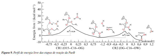 Os resultados do US sugerem um mecanismo de duas etapas, acilação e desacilação. Na primeira, há o ataque nucleofílico do OG da SER207 ao C30 do PU-MDI e, simultaneamente, a transferência do HG da SER207 para o NE2 da HISD313, ressalta-se que a desprotonação da SER207 ocorreu sem a necessidade de realizar uma varredura em duas dimensões (2D). Recentemente, Moliner e colaboradores54 estudaram esse mesmo mecanismo usando US em 2D e seus resultados, também, apontaram que o ataque nucleofílico e a desprotonação ocorrem ao mesmo tempo. Analisando as cargas parciais desses átomos conforme Tabela 1S (Material Suplementar) nota-se que a carga do OG diminuiu de -0,60 para -0,64 no TS1 (estado de transição, em inglês, transition state) aumentando a nucleofilicidade do SER207 enquanto que a carga do NE2 aumenta de -0,38 para -0,20 aumentando seu caráter ácido. A carga do C30 aumenta de 0,66 para 0,77 durante a formação da ligação química com o OG, por outro lado a carga do O31 passa de -0,56 a -0,82 pois esse oxigênio durante a formação do intermediário tetraédrico (TI), do inglês, tetrahedral intermediate, passa a fazer uma ligação simples e o O32 diminui sua carga parcial levando a quebra da ligação éster (C30--O32) do PU-MDI. Essa etapa tem uma barreira energética de 11,95 kcal mol-1. A energia de ativação calculada recentemente para esse mecanismo de degradação do PU usando, também, a PueA por outro grupo de pesquisa54 aplicando uma metodologia semelhante de QM/MM encontrou uma barreira de 22 kcal mol-1. Essa diferença nos valores pode ser atribuída aos diferentes ligantes, nesse e naquele estudo, além da escolha do método semi-empírico e a quantidade de átomos incluídos na região quântica. Depois, da transferência do HG para o O32 regenerando a HISD313, consequentemente, formando um intermediário acil-enzima (AE) e o primeiro produto, um álcool. Na PueB, a fase de acilação pode ser observada na Figura 9. Essa enzima tem apenas um resíduo catalítico (SER152), enquanto a PueA tem uma tríade catalítica (SER207, HISD313 e ASP255). Nessa primeira fase o mecanismo de degradação da PueB foi desenvolvido com base nos trabalhos de Ekici et al.,55 Lee e colaboradores,56 Hol e colaboradores.57 Esses autores investigaram a família das serina hidrolases, não comum, as quais tem no sítio ativo apenas a serina como resíduo catalítico. Nesse sentido, seus estudos sugerem que uma molécula de água pode desempenhar a função equivalente à histidina durante a catálise. Dessa forma, o ataque nucleofílico do oxigênio (OG) da SER152 ao C16 do PU-MDI e a transferência do hidrogênio (HG) para o oxigênio (OW) da água ocorrem concomitantemente formando o TI1. Analisando as cargas formais desses átomos na Figura 2S observa-se uma leve diminuição da carga do OG de -0,59 para -0,47 indicando que a SER152 tem um menor caráter nucleofílico do que a SER207. Já as cargas parciais dos átomos da molécula de água nessa fase se mantêm, praticamente, sem alterações, enquanto que a carga do C16 aumenta de 0,65 para 0,68 e a carga do O15 aumenta de -0,47 para -0,61 levando a quebra da ligação éster (O15--C16) do PU-MDI. Essa análise das cargas mostra que a densidade eletrônica se concentra no O15 e não no oxigênio da carbonila como ocorre na PueA, isso pode ser devido a um maior número de moléculas de água nas proximidades do mecanismo da PueB. Dessa forma, a fase de acilação ocorre com um custo energético de 15,10 kcal mol-1. Nota-se que a PueB precisou de 3,15 kcal mol-1 a mais para formar o TS1 em comparação com a PueA. Outrossim, observa-se nas Figuras 8 e 9 que a barreira energética dessa fase de acilação das duas enzimas é a própria etapa determinante da reação. Nesse sentido, a tríade catalítica da PueA se mostrou mais eficiente do que um único resíduo catalítico (da PueB), esse resultado vai ao encontro dos obtidos experimentalmente por Crookes-Goodson e colaboradores.18 Essa etapa é finalizada com a formação do intermediário AE e do álcool.