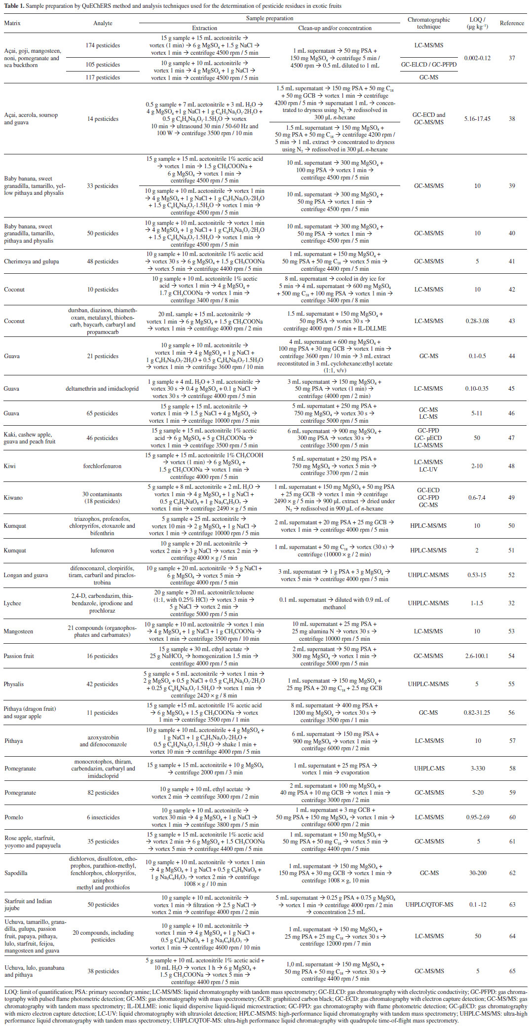 APPLICATION OF THE QuEChERS METHOD AND CHROMATOGRAPHIC TECHNIQUES IN THE DETERMINATION OF PESTICIDE RESIDUES IN EXOTIC FRUITS Although there are several options for sample preparation and devices that can be employed to evaluate pesticide residues in exotic fruits in the literature, the QuEChERS method is by far the most widely used. Table 1 lists the matrix, analytes, chromatographic technique, and limit of quantification achieved by using QuEChERS in its various versions.
