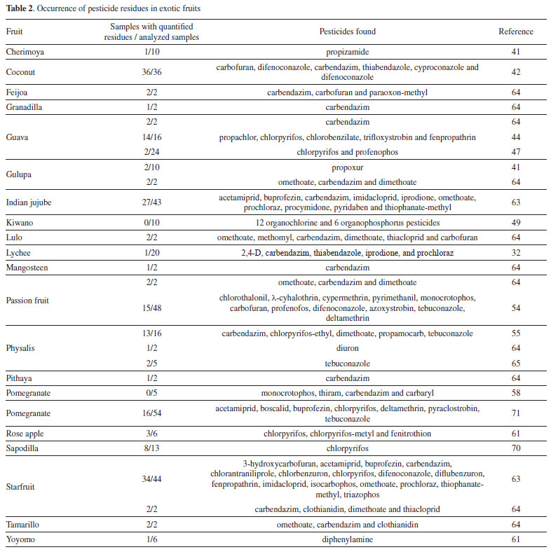 OCCURRENCE OF PESTICIDE RESIDUES IN EXOTIC FRUITS Few studies have focused on applying available methods to determine pesticide residues in exotic fruits. Table 2 shows the pesticides analyzed and the number of samples with residues in relation to the number of exotic fruit samples analyzed. The vast majority of studies have been carried out in Latin American countries and have been applied to samples from this region. The occurrence of residues indicates the need for increased monitoring to ensure the safety of these foods.