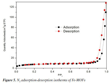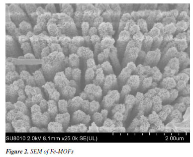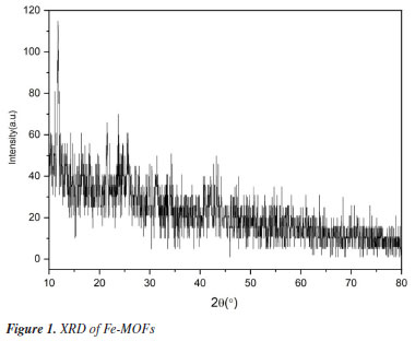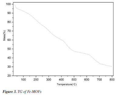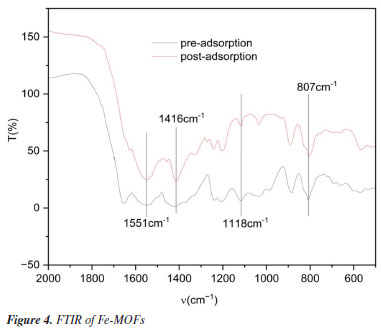 RESULTS AND DISCUSSION Characterization of Fe-MOFs materials The structure of Fe-MOFs was characterized using X-ray diffraction (XRD), scanning electron microscopy (SEM), and nitrogen adsorption-desorption isotherms. Figure 1 depicts the XRD pattern of the MOFs material, revealing a prominent peak indicative of its exceptional crystallinity. SEM imaging in Figure 2 showcases the distinctive morphology and well-dispersed crystal structure of the Fe-MOFs material. The adsorption efficiency of norfloxacin is influenced by the stability of the MOFs material. Thermogravimetric analysis in Figure 3 demonstrates three distinct stages for the Fe-MOFs material: (i) residual solvent molecules are primarily lost at an external temperature of 414 ºC; (ii) between 414 to 617 ºC, approximately 43.48% initial mass remains with a gradual decrease mainly attributed to metal ion oxidation; (iii) from 618 to 723 ºC, further mass loss occurs due to frame destruction. These findings indicate that Fe-MOFs material maintains stability up to temperatures as high as 613 ºC. In conclusion, synthetic reactions involving Fe-MOFs yield relatively stable structures formed by metal ions and organic ligands. The benzene ring in Figure 4 exhibits a prominent peak at 807 cm-1, attributed to para-substitution. The absorption peak observed at 1118 cm-1 corresponds to the C-O bond. Furthermore, coordination of metal ions with carboxyl groups results in the formation of characteristic peaks at 1551 and 1416 cm-1.30-32