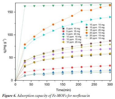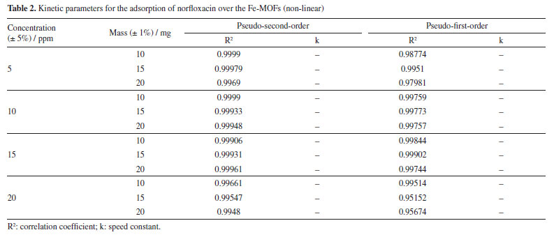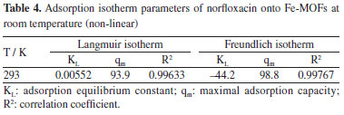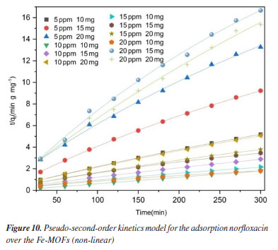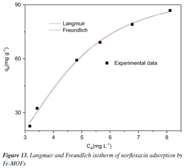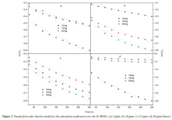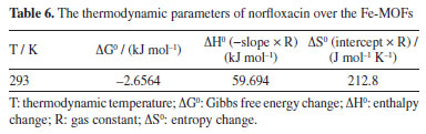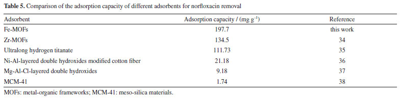 CONCLUSIONS In summary, Fe-MOFs were successfully synthesized using a hydrothermal technique and characterized through XRD, SEM, and TG analyses. These characterized Fe-MOFs were utilized for the efficient elimination of norfloxacin. The outcomes demonstrated that at pH 10, the adsorption capacity of norfloxacin reached 197.7 mg g-1. Examination of pseudo-first-order kinetics, pseudo-second-order kinetics, and adsorption isotherm indicated that the removal process of norfloxacin by Fe-MOFs followed pseudo-second-order kinetics and Langmuir adsorption isotherm models. Moreover, the results indicate that Fe-MOFs exhibit improved adsorption capabilities towards norfloxacin due to the combined effects of physical and chemical adsorption mechanisms. These findings highlight the promising potential of Fe-MOFs as highly effective materials for applications in removing antibiotics.