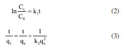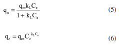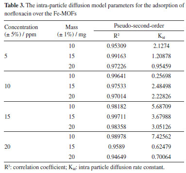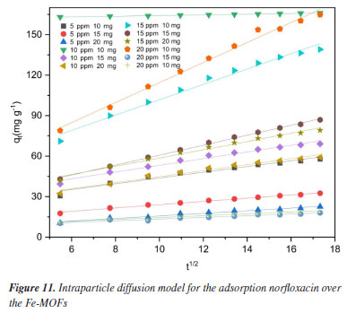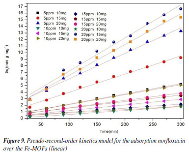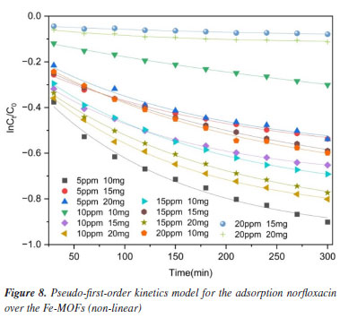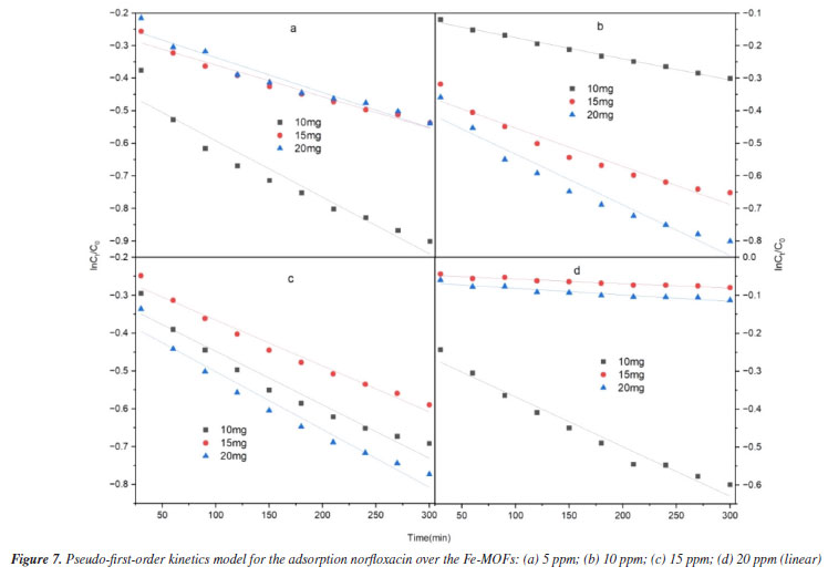 To validate theoretical predictions with practical observations regarding norfloxacin removal, we describe below the kinetic model for pollutant elimination based on existing experimental diagrams and data. ![]() In the provided Equations 2 and 3, Ct (ppm), C0 (ppm), k1 (L min-1), k2 (g mg-1 min-1) and t (min) represent the concentration of norfloxacin at a specific time point, initial concentration of norfloxacin, rate constant for the kinetic reaction, and duration of the reaction at time t, respectively. qt (mg g-1) and qe (mg g-1) denote the concentration of adsorbent material at time t and equilibrium state, respectively. The results obtained from assessing Fe-MOF’s efficacy in removing norfloxacin are presented in Figures 7-10, Tables 1 and 2, with correlation coefficients (R2) surpassing 0.99. The adsorption strength of the adsorbent to the adsorbate increases with a higher adsorption correlation coefficient, indicating that the adsorbent can effectively immobilize the adsorbate on its surface during the process of adsorption, thereby leading to enhanced separation or purification outcomes. The reaction rate constant k can serve as an indicator of the reaction’s velocity, with a higher value indicating an accelerated rate and a lower value suggesting a decelerated rate. This suggests that the utilization of a quasi-second-order kinetic model can effectively elucidate the adsorption process by Fe-MOFs, thereby providing substantial evidence for the theoretical validity and practical applicability of Fe-MOFs in norfloxacin removal.