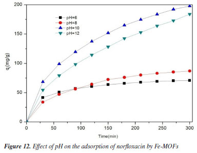 The influence of pH on the adsorption behavior of norfloxacin To investigate the impact of different pH levels on the efficiency of norfloxacin removal, we evaluated the adsorption performance of Fe-MOFs material using norfloxacin solutions with varying initial pH values (pH = 6, 8, 10, and 12) at a concentration level of 15 ppm. As illustrated in Figure 12, it was observed that within the pH range from 6 to 10, there was a decrease in norfloxacin adsorption as the solution’s pH decreased. Specifically, at a pH value of 10, the measured adsorbed capacity for norfloxacin was approximately found to be 197.7 mg g-1. Conversely, when the solution’s pH dropped to 6, there was a reduction in adsorption capacity to around 70.7 mg g-1. Interestingly enough, upon increasing the solution’s pH to reach a value of 12, a slight decline in adsorption capacity to approximately 183.7 mg g-1 was noted. The primary factors contributing to this outcome are the concentration of the solution and material electrification, which result in varying concentrations of hydrogen ions in norfloxacin solutions with different strengths. Additionally, the charge of Fe-MOFs tested was measured at 3.26 mV. Therefore, besides any structural irregularities in Fe-MOFs, there exists a correlation between their charge and the observed results.33