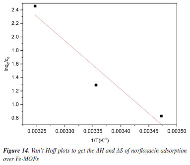 In order to assess the influence of temperature on the adsorption characteristics of norfloxacin by Fe-MOFs, a solution containing 15 ppm concentration of norfloxacin was treated with 20 mg of Fe-MOFs material. The impact of different temperatures (T = 15, 25, 35 ºC) on the interaction between Fe-MOFs and norfloxacin during the adsorption process was investigated. The experimental procedure can be summarized as follows: ![]() For this study, we employed the ideal gas constant (R = 8.314 J mol-1 K-1) and Langmuir adsorption constant (K0 in L mol-1). To determine the values of ΔH0 (enthalpy) and ΔS0 (entropy), a linear regression analysis was performed by plotting lnK0 against 1/T using a van’t Hoff plot. Specifically, ΔH0 was calculated as the negative slope multiplied by R, while ΔS0 was obtained from the intercept multiplied by R. According to the existing literature,23 it has been documented that enthalpy changes ranging from 84 to 420 kJ mol-1 indicate chemical adsorption, while an enthalpy change below 84 kJ mol-1 suggests physical adsorption. The experimental results presented in Figure 14 and Table 6 provide compelling evidence supporting the endothermic and spontaneous adsorption of norfloxacin by Fe-MOFs. Therefore, it can be inferred that the predominant mechanism underlying norfloxacin’s adsorption onto Fe-MOFs is primarily of a physical nature. Consequently, alterations in entropy and enthalpy significantly influence norfloxacin’s adsorptive behavior on Fe-MOFs.39 Physical interactions serve as the main driving force behind the process of adsorption.