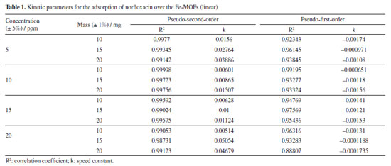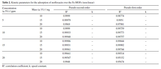 Fuhua Wei; Qinhui Ren; Nannan Wang; Hongliang Chen; Yutao Zhang; Zhao Liang I. College of Chemistry and Chemical Engineering, Anshun University, 561000 Anshun, Guizhou, China Received: 07/06/2024 *e-mail: wfh.1981@163.com; walleliang@163.com The synthesis of Fe-MOFs (metal-organic frameworks) was conducted using a solution heat method, followed by characterization through XRD (X-ray diffraction), SEM (scanning electron microscopy), and TG (thermogravimetry) analysis techniques. Subsequently, the Fe-MOFs were employed for norfloxacin removal. The experimental findings demonstrate that theoretical simulations of norfloxacin adsorption by Fe-MOFs involved the application of pseudo-first kinetic model, pseudo-second kinetic model, and adsorption isotherm. Chemisorption was identified as the primary mechanism observed. Notably, a maximum adsorption capacity of 197.7 mg g-1 was achieved at pH 10. These results underscore the practical feasibility of utilizing Fe-MOFs in applications related to norfloxacin adsorption. INTRODUCTION Considerable quantities of hazardous substances are released into the environment through both domestic and industrial activities, resulting in significant detrimental effects on human health and ecosystems.1 These substances encompass heavy metals, antibiotics, chemicals employed in industries, additives present in food products, veterinary drugs, pharmaceuticals, and personal care items,2-4 all of which pose grave risks to both humans and the natural world. According to recent statistical trends, it is projected that the global population will exceed 10 billion individuals by 2050.5,6 Approximately 30% of the world’s population lacks access to potable water.7 Specifically, the utilization of antibiotics significantly contributes to environmental contamination due to their potent bactericidal or bacteriostatic properties. These substances find extensive application in medical, agricultural, and aquacultural sectors. Mulchandani et al.8 recent investigation reveals an estimated annual antibiotic consumption of approximately 107,500 tons in livestock worldwide by 2030, representing a notable increase from less than 100,000 tons recorded in 2020. Notably, Asia (particularly China) exhibits the highest rates of antibiotic usage. Furthermore, there is an anticipated additional surge of around 8% in antibiotic consumption between the years 2020 and 2030. The inadequate management of these pollutants has led to extensive water pollution, exacerbating the global issue of water scarcity.9 It is evident that finding efficient and cost-effective approaches to eliminate these contaminants presents a significant challenge. Various technologies, including filtration, chemical precipitation, and coagulation/flocculation, have been employed for their removal; however, they are associated with drawbacks such as complex equipment requirements and expensive maintenance expenses.10 Therefore, it remains crucial to explore effective strategies for eradicating these pollutants. Physical, biological, and chemical techniques are commonly utilized for successful control of these harmful substances.11-14 Adsorption technology has gained widespread acceptance due to its straightforward operation and resistance against toxins or poisons while offering opportunities for reuse along with effective removal capabilities against various types of pollutants.15-20 The adsorption process is influenced by various factors, such as surface area, pore volume, and functionality.1-3 Metal-organic frameworks (MOFs) have emerged as highly efficient adsorbents due to their ability to easily customize pore size and structure. These frameworks are formed by connecting inorganic metal atoms (as nodes) with organic ligands (as linkers). They possess a large surface area, numerous active sites, adjustable functional groups, and the capability of charge separation under normal light conditions. MOFs are extensively studied both domestically and internationally due to their diverse variations in coordination bonds. The utilization of MOFs has become an exciting field within coordination chemistry.21,22 Given these exceptional characteristics exhibited by MOFs, they find widespread applications in various areas including separation,23 sensing,24 catalysis,25 storage,26 etc. Consequently, many scientists specializing in materials and chemistry have redirected their focus towards exploring the potential applications of MOFs.27-29 Considering the aforementioned factors, this study focuses on utilizing 2,5-dihydroxyterephthalic acid as an organic ligand and ferrous sulfate heptahydrate as a metal precursor to synthesize Fe-MOFs for the purpose of antibiotic elimination. The results demonstrate that Fe-MOFs exhibit significant efficacy in norfloxacin eradication.