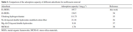 To demonstrate the efficacy of Fe-MOFs in norfloxacin removal, a comparative analysis presented in Table 5 reveals that Fe-MOFs exhibit superior advantages over other adsorbents. The rationale behind this observation is as follows: firstly, the porous structure of Fe-MOFs enables efficient infiltration of norfloxacin into its interior. Secondly, both Fe-MOFs’ ligands and norfloxacin contain benzene rings, facilitating their adsorption through π-π bond interactions. Thirdly, hydrogen bonding potential exists between the surface of Fe-MOFs and norfloxacin, thereby enhancing their adsorption capacity. Fourthly, due to its charge properties, Fe-MOFs possess a zeta potential value of 3.26 mV; similarly, the surface functional group of norfloxacin also carries a slight charge. Consequently, electrostatic forces play a significant role in effectively capturing norfloxacin by Fe-MOFs.34,35 Collectively, these aforementioned factors contribute to the exceptional performance demonstrated by Fe-MOFs in removing norfloxacin from solutions.