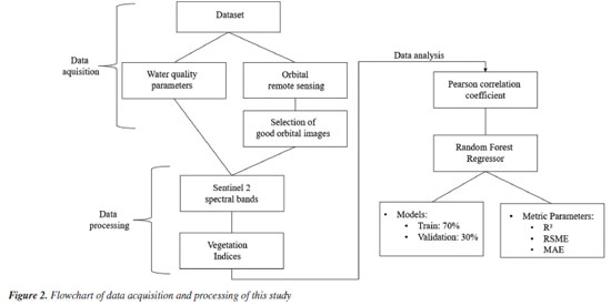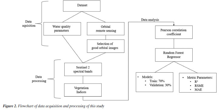 Dataset The database was composed of water quality parameters provided by CODAU (in Portuguese, this means Companhia Operacional de Desenvolvimento, Saneamento e Ações Urbanas, or Operational Company for Development, Sanitation and Urban Actions) and orbital remote sensing data, obtained free of charge through imaging from the Sentinel-2 constellation, with medium spectral resolution. We chose orbital remote sensing because it is a non-destructive and sustainable method and facilitates access to hard-to-reach areas, as seen in this study, for collecting water quality parameters (Figure 1). Orbital remote sensing was chosen because the samples were collected in locations with riparian forests, dense vegetation, or difficult access, where aerial imaging or proximal remote sensing would be unfeasible due to the presence of trees, branches, and other obstacles. The vegetation indices were meticulously selected through a thorough brainstorming session, taking into account the indices most commonly used in scientific remote sensing research. This careful selection process ensures the robustness of our research. The database was meticulously composed, encompassing a range of water quality parameters (chloride, O2, iron, nitrate, nitrite, ammonia, total phosphorus, total nitrogen, chemical oxygen demand (COD), and biochemical oxygen demand (BOD)). For each parameter, two scenarios were explored using orbital remote sensing. In scenario I, we utilized spectral bands (blue (B), green (G), red (R), red-edge 2 (Re2), near-infrared (NIR), shortwave infrared 1 (SWIR1), and shortwave infrared 2 (SWIR2)) along with a single water quality parameter. In scenario II, we considered vegetation indices such as simple ratio (SR); normalized difference vegetation index (NDVI); normalized difference red edge index (NDRE); nonlinear vegetation index (NLI); normalized difference water index (NDWI); difference vegetation index (DVI); blue-normalized difference vegetation index (BNDVI); inverse of the simple ratio (ISR); green normalized difference vegetation index (GNDVI); red green blue vegetation index (RGBVI); soil adjusted vegetation index (SAVI); chlorophyll index-red edge (CIRE); infrared percentage vegetation index (IPVI); enhanced vegetation index (EVI); and enhanced vegetation index 2 (EVI2) alongside a single water quality parameter. This comprehensive approach ensured that the inputs were spectral bands (scenery I) or vegetation indices (scenery II), and as a response variable of the model, only one water parameter was evaluated at a time, obtaining a model for each parameter, which were carefully considered and evaluated according to the accuracy of each model. In addition, the dataset was composed of these data and evaluated in function of two scenarios (water parameters and spectral bands; and water parameters and vegetation indices) to investigate the best correlation among the data because we know there are different factors influencing the quality of water and affects the interaction of electromagnetic radiation with water, for example, phytoplankton, organic matter, inorganic minerals and others.14-16 Data acquisition and processing Figure 2 demonstrates the robust database, which includes water quality parameters and orbital images sourced from the highly reliable Sentinel‑2 satellite (a passive sensor) of the Copernicus Open Access Hub website.17 The images were carefully selected, ensuring that only those without clouds or cloud shadows (referred to as ‘good images’) were chosen using the QGIS software, version 3.28.18 The orbital sensing data (spectral bands and vegetation indices) were extracted from the same location as the collection points’ geographic coordinates, further enhancing the data’s reliability. The wavelengths of the spectral bands used in the research are detailed in Table 1S (Supplementary Material). The vegetation indices were calculated from these wavelengths, as determined by the equations in Table 2S (Supplementary Material).