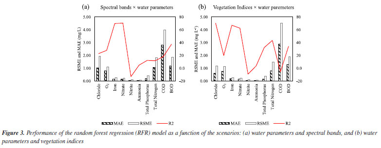 RESULTS AND DISCUSSIONS Selection of variables for estimation of water parameters Initially, the remote sensing variables (spectral bands and vegetation indices) most relevant for estimating each water parameter were selected to determine their relationship. For this, Pearson’s correlation coefficient was calculated for each scenario to verify which vegetation bands or indices correlate most with each parameter, as seen in Figures 1S and 2S (Supplementary Material). For chloride, it is important to note that NIR and Re2 are the ones with the highest correlation coefficient among other spectral bands in scenario I (Figure 1Sa), but it is a weak correlation (less than 0.3). This is a key point, as it suggests that these wavelengths, despite their higher correlation when compared to other wavelengths, may not be the most effective for detecting chloride levels. Similarly, in scenario II (Figure 2Sa), DVI and EVI show a higher correlation coefficient than the others, but also have a weak correlation (less than 0.3), indicating that these wavelengths may not be ideal for this purpose either. This fact was already expected, since the remote sensing of aquatic bodies cannot detect changes in the reflectance of substances that have a lot of interaction with organic matter, since, for example, the reflectance of chlorine changes rapidly by adsorption in organic matter, as chlorine reacts with organic matter and forms other compounds, such as the byproducts of disinfection (trihalomethanes, chlorates, bromates, among others) and this confuses the sensors.20 For dissolved oxygen, in scenario I (Figure 1Sb), it is possible to notice that NIR and Re2 presented a higher correlation coefficient than other wavelengths but also a weak correlation (less than –0.3). In scenario II (Figure 2Sb), DVI and EVI showed a higher correlation coefficient, but the correlation was also weak (less than –0.3). Conversely, for iron in the scenario I (Figure 1Sc), SWIR 1 revealed a moderate negative correlation, with the correlation coefficient ranging between –0.5 and –0.6.21 This implies that as the wavelength of the spectral band increases, the iron content decreases, a significant finding for environmental monitoring. In scenario II (Figure 2Sc), the correlation coefficient was higher for NDRE, but since the correlation coefficient is between 0.3 and 0.4, it is a weak correlation.21 For nitrate in scenario I (Figure 1Sd), blue presented a higher correlation coefficient than the other spectral bands, but the correlation is weak (less than 0.3). In scenario II (Figure 2Sd), BNDVI presented a higher correlation coefficient, but the correlation was weak (less than –0.3). For nitrite in scenario I (Figure 1Se), the correlation coefficients were very low, with Re2 having the highest correlation coefficient but less than 0.2, which is considered a weak correlation.21 In scenario II (Figure 2Se), the correlation coefficients were also lower than 0.2, with the highest being the BNDVI, and therefore the correlation is weak. For ammonia in scenario I (Figure 1Sf), red showed a higher correlation coefficient than the other spectral bands, but the correlation was weak (less than –0.2). In scenario II (Figure 2Sf), BNDVI had a higher correlation coefficient, but the correlation was weak (less than 0.2). For total phosphorus, NIR displayed a higher correlation coefficient in scenario I (Figure 1Sg), but the correlation was weak (less than 0.2). In scenario II (Figure 2Sg), EVI showed a higher correlation coefficient, but the correlation was also weak (less than 0.3). For total nitrogen in scenario I (Figure 1Sh), SWIR 1 showed a higher correlation coefficient, but the correlation was weak (–0.3). For scenario II (Figure 2Sh), CIRE showed a higher correlation coefficient, but the correlation was weak (less than 0.4). For COD in scenario I (Figure 1Si), red had a higher correlation coefficient, but the correlation was weak (less than –0.2). In scenario II (Figure 2Si), RGBVI showed a higher correlation coefficient, but the correlation was weak (less than 0.3). For BOD in scenario I (Figure 1Sj), NIR and Re2 showed a higher correlation coefficient, but the correlation was weak (less than 0.2). In scenario II (Figure 2Sj), DVI, SAVI, and EVI2 had a higher correlation coefficient, and the correlation was weak (less than 0.3). Random forest regression Figures 3a and 3b show the MAE, RSME and R2 of the data for each parameter. The higher the R2 value and the lower the values for MAE and RSME, the greater the estimate’s accuracy.22 It can be seen in Figure 3a that for iron and nitrate, the R2 value is high. At the same time, MAE and RSME are low, so it is possible to develop a model correlating iron and nitrate with the spectral bands using the RFR algorithm. On the other hand, R2 of nitrite, for example, was very low, as was for ammonia and total phosphorus. For COD, total nitrogen, dissolved oxygen, chloride, and BOD, the values of MAE and RSME are very high, which makes it unfeasible to estimate these parameters using RFR using spectral bands.