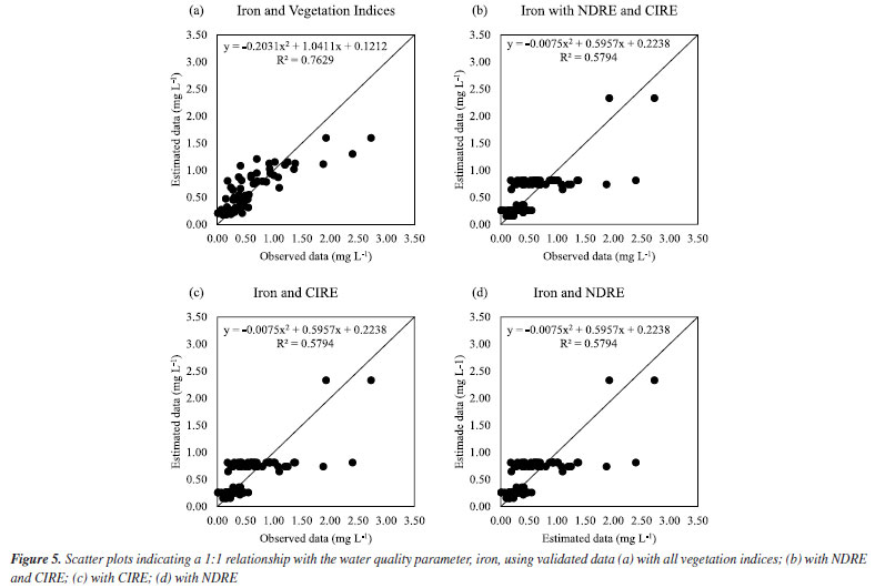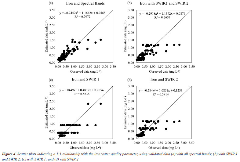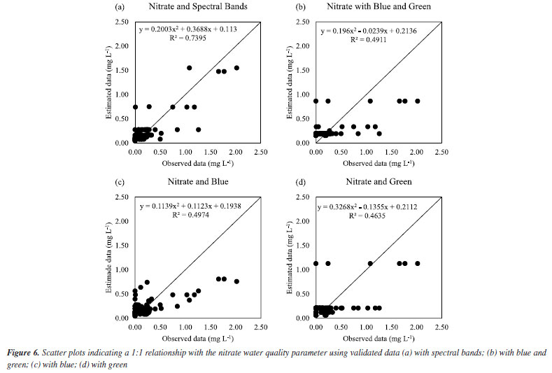 Thus, the best fit for iron is in scenario I. It was already expected that iron could be estimated via orbital remote sensing since iron can give characteristic color to the water since dissolved iron (ferrous ion) transforms into ferric ion (ferric oxide and ferric hydroxide) in contact with air and thus forms rust and this color can be captured in orbital images, once the orbital satellite generates a signal that interacts with water, which generates a signal in the form of spectral bands.24,25 For nitrate, in scenario I, Figure 5Sa (Supplementary Material), for all spectral bands, it is noted that the estimated data followed the observed data better, and Figure 5Sb, for blue and green, Figure 5Sc for blue only, and Figure 5Sd for green only, the estimated data did not follow the observed data so well. This can be proven by Figure 6a, in which a good fit was obtained, and the R2 value was 73.95% with all spectral bands. For Figures 6b-6d we did not obtain such an impactful R2.