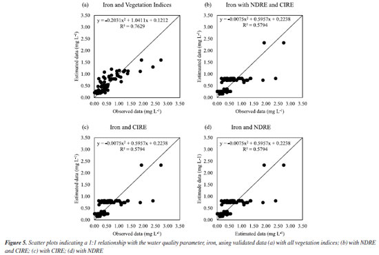 Figure 3b shows that chloride, iron, and nitrate had high R2 and low MAE and RSME, which shows that it is possible to estimate these parameters by RFR using vegetation indices. On the other hand, nitrite showed very low R2, as well as dissolved oxygen, ammonia, and COD. Therefore, the RFR algorithm is not recommended to estimate these parameters using vegetation indices. BOD, total nitrogen, and COD showed very high MAE and RSME, which shows that estimating these parameters using vegetation indices based on RFR is impossible. In addition, the dataset was composed of these data and evaluated in function of two scenarios (water parameters and spectral bands; and water parameters and vegetation indices) to investigate the best correlation among the data because we know there are different factors influencing the quality of water and affects the interaction of electromagnetic radiation with water, for example, phytoplankton, organic matter, inorganic minerals and others.14-16 Performance of validated models The results, as depicted in Figure 3, underscore the significant performance of the RFR algorithm. It demonstrated unparalleled precision and accuracy in estimating key water quality parameters such as iron, nitrate, chloride, total phosphorus and total nitrogen. Visual representations of the iron correlation with the spectral bands (scenario I) are presented in Figures 3Sa-3Sd (Supplementary Material). The models, adjustment curves, and coefficient of determination for each situation can be observed in Figures 4a-4d.