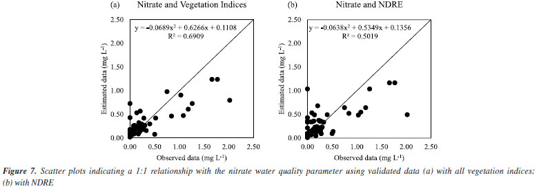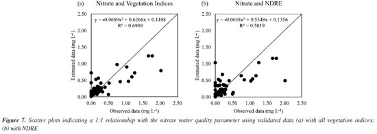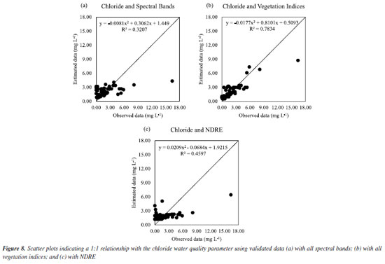Thus, in the case of nitrate, the best way to estimate it would be with all spectral bands (scenario I). Another study26 also sought to estimate nitrate using a model obtained by the RFR for groundwater and found an adjustment with R2 of 89.10%. For chloride, in scenario I, Figure 7Sb (Supplementary Material) shows that the estimated data followed better the data observed with all vegetation indices (scenario II) than with all spectral bands (Figure 7Sa) and only with NDRE (Figure 7Sc). This can be confirmed by Figure 8b, in which a good fit was obtained with R2 of 78.34%. For Figures 8a and 8c, R2 was not impactful.