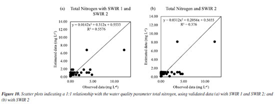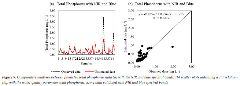 Thus, the best fit to estimate chloride by the RFR was scenario II, with all vegetation indices. Another study27 was also able to obtain a regression model for chloride using Sentinel 2A images and obtained an R2 of 80.80%. For total phosphorus, the best regression was for scenario I with only NIR and blue, as seen in Figure 9a. The estimated data followed the observed data well, with R2 of 62.79%. This is considered a low value, since phosphorus is important in the detection of eutrophication of surface water sources.28 A recent study29 also sought to obtain a regression with an algorithm correlating the reflectance of remote sensing with the values of parameters contained in surface waters. An adjustment with R2 of 75.96% was found for the total phosphorus.