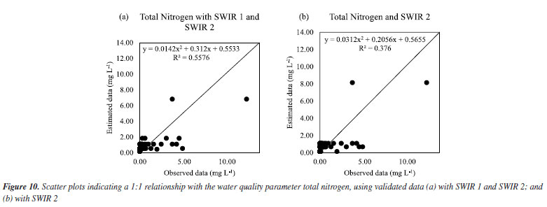 For total nitrogen, the estimated data better matched the data observed with SWIR 1 and SWIR 2, as seen in Figure 8Sa (Supplementary Material) and confirmed in Figure 10a, in which an adjustment with R2 of 55.76% was obtained. It should be noted that using RFR did not obtain an impactful R2 value. A survey also used Sentinel-2 images to obtain a regression model to estimate nitrogen using orbital remote sensing obtained in two distinct regions: in one region it was obtained an R2 of 67.00%, and in another region, an R2 of 78.32%.30