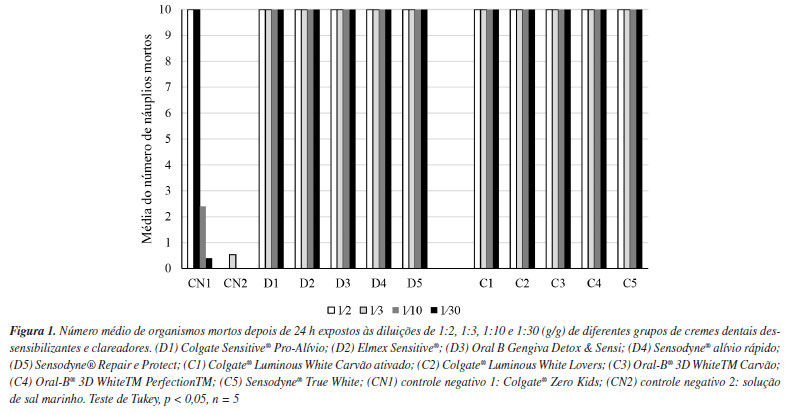 RESULTADOS E DISCUSSÃO Apesar dos cremes dentais de diferentes composições e indicações serem usados diariamente em todo o mundo, pouco se sabe o efeito ambiental desses produtos lançados nos efluentes. Assim, mostrou-se que os cremes dentais dessensibilizantes e clareadores influenciaram na viabilidade de bioindicadores da vida aquática e terrestre, o que levou a rejeitar a hipótese nula. Os slurries de 1:2 e 1:3 foram testados inicialmente no presente estudo por representarem padrões de proporção mais comumente usados para preparar cremes dentais em estudos in vitro21,22 por simular a situação clínica da escovação dental com a diluição do creme dental pela saliva na cavidade oral e expectoração no esgoto doméstico. Entretanto, diante da mortalidade dos náuplios, optou-se por aumentar aleatoriamente a diluição dos slurries (1:10 e 1:30). Na Figura 1, verificaram-se mortalidade de todos os náuplios submetidos aos cremes dentais dessensibilizantes e clareadores, frente a média de mortalidade de 0,53 no grupo controle (apenas solução de sal marinho), com diferença estatisticamente significativa (p < 0,001). Entretanto, na formulação Colgate® Zero Kids, a média de mortalidade foi de 2,40 náuplios na concentração 1:10 (g/g) e 0,40, no slurry de 1:30 (g/g). Este último não apresentou diferença estatisticamente significativa em relação ao controle com solução de sal marinho (p < 0,05).