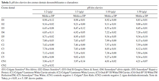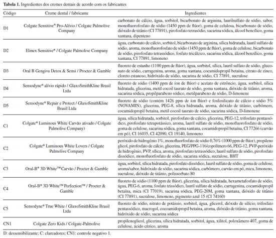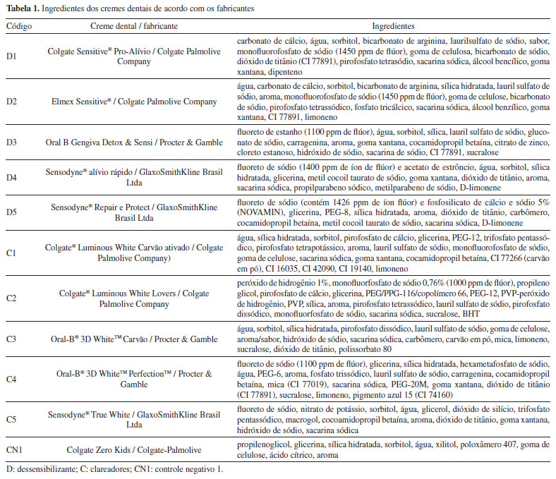 PARTE EXPERIMENTAL Trata-se de um estudo de ecotoxicidade laboratorial in vivo em bioindicadores (organismos alternativos ao estudo tradicional em animais). Onze diferentes cremes dentais foram selecionados de acordo com a indicação: dessensibilizantes (D; n = 5) e clareadores (C; n = 5). Além destes, um creme dental infantil com composição sem detergente e flúor foi selecionado aleatoriamente como controle negativo 1 (CN1). O segundo controle negativo (CN2) foi solução de sal marinho (25 g L–1), para teste com A. salina; água mineral, para teste com A. cepa; e água destilada-deionizada para teste de pH dos cremes dentais. Os ingredientes dos cremes dentais estão descritos na Tabela 1. Os slurries de cremes dentais foram preparados nas proporções de 1:2, 1:3, 1:10 e 1:30 (creme dental/diluente), em peso, com o auxílio do agitador vórtex.