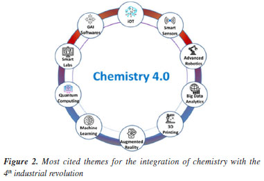 Ana Paula N. de SouzaI; Gabriel Francisco S. da SilvaI; Bernardo Cardeal DarzéI I. Departamento de Química Geral e Inorgânica, Instituto de Química, Universidade do Estado do Rio de Janeiro, 20550-013 Rio de Janeiro - RJ, Brasil Received: 03/17/2024 *e-mail: jaqueline.senra@uerj.br The 4th Industrial Revolution is well described as a digital revolution in which the integration between the physical, biological and digital fields can prompt unprecedented results in terms of research, innovation and products. Our brief discussion is built upon chemistry as a fundamental science in this context: it emerges with contributions for advanced digital technologies along with clean energy, sustainable processes and circular economy for the industry 4.0. Since the previous industrial revolutions brought uncertainty in the environment-chemistry binomial it is urgent achieving a systemic industrial innovation in order to promote a technological, energetic and social transition toward a sustainable future, especially in the alarming context of climate change. Despite the Brazilian chemical industry represents the largest in the Southern hemisphere it has few integrated chemical supply chains which represents a bottleneck toward advances in the manufacturing base. Within both academy and industry, the groundbreaking shift in the chemical sector can enable opportunities to chemists build a better future. At the same time, a paradigm shift is leading us to new methods, models and, consequently, disruption in the way of producing and sharing knowledge. Finally, some skills were proposed for chemists within the framework of the 4.0 era. INTRODUCTION Revolutions occur as a reflection of changes related to the status quo. Throughout human history, countless revolutions have had profound impacts, from the collapse of empires to changes in scientific paradigms, for instance. In general, analysis of social, political and scientific revolutions provides some insights into the facts that led to turning points that culminated to changes in current models. From an economic point of view, the 19th and 20th centuries can be considered landmarks for the contemporary age, since they are linked to the emergence of the first Industrial Revolutions, which brought profound changes to labor relations and the mechanisms for producing goods.1 The first Industrial Revolution, which took place at the end of the 18th century and the beginning of the 19th century, promoted a shift from manual work to mechanized processes and allowed new professions to emerge. These initial changes culminated in the rapid development and establishment of high-tech industries - engineering, aviation, chemistry, etc., which led to the second Industrial Revolution (which took place in the second half of the 19th century until the first half of the 20th century) and the intensification of the mechanization of production and consumption.1 With the increased demand for science and technology, the "scientific" professions took on a prominent role, given the urgency of mass industrial production. The third Industrial Revolution was characterized by major advances in telecommunications technologies, information sciences and more sophisticated automation of production processes. These aspects allowed for greater integration of the production process. The main consequence was the acceleration of technologies in the microelectronics industry (perhaps better defined today as nanoelectronics), supercomputers and programming logic to increase automation performance.1 The 4th Industrial Revolution, which is already underway, has distinct features from previous ones, being characterized by a strong integration between cyber-physical and biological systems, i.e., a great connection between virtuality and reality made possible by the use of artificial intelligence, to unprecedented dimensions.2 These aspects are not limited to the industrial sector alone, but are having an impact on various sectors of society. The real dimension of the 4th Industrial Revolution emerged in 2011 in Germany, where the term industry 4.0 was coined to indicate a futuristic vision of "autonomous factories", which would have sophisticated automation and decision-making power based on artificial intelligence.3 In an expanded conception that goes beyond the productive sectors, the new revolution has been associated with a kind of fusion between the boundaries of the physical, biological and digital dimensions. Unlike the 3rd revolution - which was based on the increase in hardware - digital technologies are being a driving factor in the creation of new realities: with a decentralized internet focused on immersive experiences well adapted to user behavior (web 3.0), it will be possible to offer a wide range of options to consumers very soon. The four main points that permeate the new digital revolution centered on artificial intelligence involve the concepts and applications related to the internet of things (IoT), Big Data, cloud computing and machine learning. Examples of this integration include smart homes, autonomous vehicles, image recognition and financial transactions mediated by blockchain. In this scenario, the arrival of new technologies has led to the creation of countless new professions that can support the technological cyber chain.4 In this way, it is likely that the digital revolution will also bring about a new reality with impacts on the social sphere and many others. However, the lack of public discussion5 along with media information about the consequences may worsen uneven, especially within peripheral societies. Although the socio-economic factor is inseparable from the analysis of the industrialization processes that have taken place since the first Industrial Revolution, the different factors that have contributed to the individual processes of various societies are beyond the scope of this article. However, some reflections on the asymmetrical development of diffe