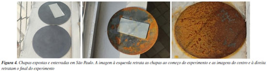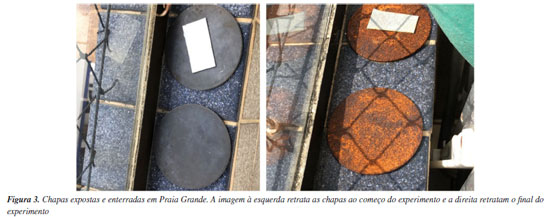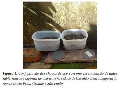 | Análise dos efeitos de corrosão sob chapas de aço-carbono 1020 causadas por aerossol marinho e poluição: um estudo comparativo em chapas expostas ao ambiente e em simulação de dutos subterrâneos Analysis of the effects of corrosion under 1020 carbon-steel plates caused by sea air and pollution: a comparative study in plates exposed to the environment and in simulation of underground ducts |