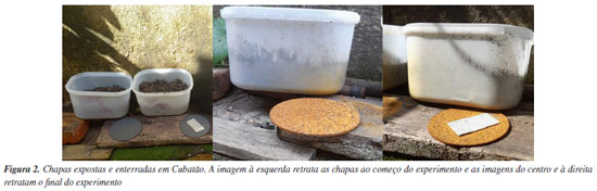 PARTE EXPERIMENTAL Instrumentação Para a pesagem das chapas de aço-carbono 1020, foi utilizada uma balança semi-analítica modelo BEL M214Ai. A análise das soluções de tiocianato de ferro foi realizada em um espectrofotômetro modelo NOVA 1600 UV, de sistema de feixe simples com capacidade de medir comprimentos de onda entre 190 e 1100 nm. Materiais e reagentes Utilizou-se chapas de aço-carbono 1020 de medidas de 8,8 cm de diâmetro e 2 mm de espessura e ânodos de sacrifício de zinco com 3 cm de comprimento, 5 cm de largura e 1 mm de espessura. A conexão entre o ânodo e a placa foi estabelecida posicionando o ânodo na superfície superior da placa sendo que a corrente elétrica é formada pelo contato direto entre o ânodo e o metal a ser protegido.10 Na análise espectrofotométrica dos íons férricos nas amostras, foram utilizados os seguintes reagentes: tiocianato de potássio (KSCN), ácido clorídrico (HCl), cloreto de ferro III (FeCl3) e água deionizada. Organização das chapas de aço-carbono 1020 Com base no estudo comparativo de corrosão de metais em condições salinas de Suski et al.6 foi escolhido, para a condução dos experimentos, o aço-carbono 1020 por sua alta suscetibilidade a corrosão. Segundo a norma ABNT/CB-28, citada por Medeiros,9 os dois primeiros algarismos determinam a classe do aço e os dois últimos estabelecem a média do teor de carbono presente multiplicada por 100. Ao utilizar a classificação "1020" para o aço-carbono, explicita-se as seguintes características: 10XX (indicando ser um aço-carbono) e XX20 (indicando 0,20% de carbono em sua composição).9 Após a pesagem, as chapas foram numeradas e separadas para a montagem da simulação de dutos subterrâneos e anexação dos ânodos de sacrifício. Tendo como referência a simulação de Castro,11 foi projetado um sistema consistido de um conjunto de recipientes plásticos com orifícios em sua base para vazão de água, preenchidos de cascalho na primeira camada e, por conseguinte, terra até sua posição superior, sendo essa a porção em que as chapas ficaram contidas. O estudo envolveu a exposição de placas ao meio ambiente em duas configurações diferentes para cada uma das cidades avaliadas. Para isso, utilizou-se uma placa em contato com o ânodo de sacrifício e uma placa livre de ânodo. Nos casos em que houve a aplicação de ânodo de sacrifício, bastou o contato físico entre o aço e o zinco. Essas duas configurações foram realizadas em duas maneiras de simulação, tanto em placas expostas ao ambiente quanto em placas enterradas em sistemas simuladores de dutos subterrâneos. Em ambas as configurações a placa foi posicionada paralelamente ao chão, como exemplificado na Figura 1.
