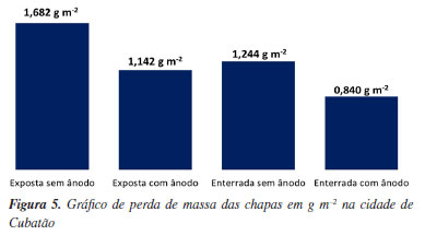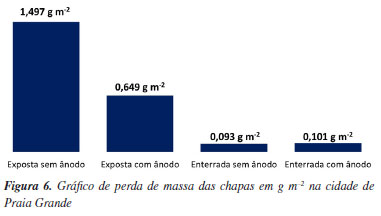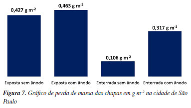 Além da comprovação visual de corrosão, determinou-se a perda de massa de todas as chapas de aço-carbono 1020 a partir do método de pesagem. As Figuras 5, 6 e 7 demonstram os gráficos comparativos apresentando a perda de massa após análise.