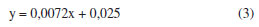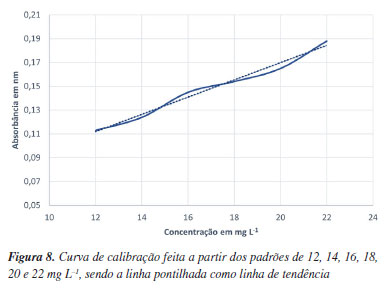 O coeficiente de correlação (r2) é de 0,9832. Tendo ciência da equação dada pela curva de calibração presente na Figura 8, calculou-se as concentrações em mg L-1 de cada uma das chapas utilizando a Equação 3, obtendo os resultados da Tabela 1.