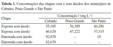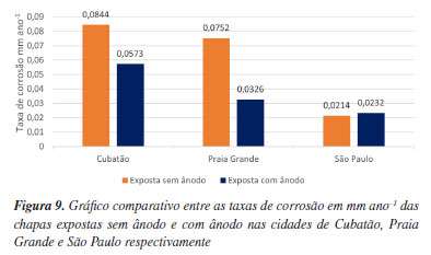 Nota-se que a corrosão é mais grave nos municípios de Cubatão e Praia Grande quando comparadas com a corrosão sofrida em São Paulo. Segundo os estudos de Araújo e Silva,5 realizado no Maranhão, e de Luz,16 realizado em Santa Catarina, regiões litorâneas possuem taxas de corrosão superiores a locais de maiores altitudes independente da região do Brasil. Isso se dá pela presença de íons cloretos nas regiões litorâneas do país, advindos do mar. Em nenhum caso notou-se uma redução significativa de taxa de corrosão devido à presença de ânodo, possivelmente por conta do tempo limitado de análise, que restringiu a perda de massa e o tempo de exposição em horas, ambas variáveis no cálculo da taxa de corrosão. Na espectrofotometria, entretanto, as chapas que possuíam ânodos demonstraram menor presença de Fe3+, indicando a efetividade do método protetivo. Durante a pesagem e em análise aos valores de taxa de corrosão, as chapas expostas obtiveram maior perda de massa para todos os municípios. Para Cubatão, contudo, na espectrofotometria, como demonstrado na Tabela 1, percebe-se maiores concentrações de ferro nas chapas enterradas. Especula-se que o ocorrido se dá pelo processo de lixiviação, o qual faria com que o ferro presente no solo se depositasse nas chapas, sendo exposto ao mesmo processo de análise e, consequentemente, alterando o resultado da espectrofotometria.17 Reforça-se que esse processo não alteraria na análise da perda de massa pelo método de pesagem, visto que as chapas foram pesadas após o lixamento, o que retiraria o ferro proveniente do solo. Ainda analisando a Tabela 1, não foi possível quantificar a concentração de ferro nas chapas enterradas de Praia Grande e a enterrada com ânodo em São Paulo, devido a uma quantidade insignificante de Fe3+ nas soluções. No caso de Praia Grande, isso pode ser justificado pela taxa de corrosão ínfima, de 0,0047 e 0,0051 mm ano-1 para a chapa sem e com ânodo, respectivamente. Para a formação de Fe3+ é necessário que ocorra antes a formação de Fe2+, íon inquantificável na metodologia utilizada. Portanto, é possível que a quantidade de massa perdida durante o processo corrosivo das chapas em questão tenha sido majoritariamente na forma de Fe2+.1 Já para a placa enterrada com ânodo em São Paulo, embora a perda de massa e a taxa de corrosão tenham sido três vezes maiores que a da chapa sem ânodo, como demonstrado nas Figuras 7 e 10 respectivamente, não fora possível quantificar o ferro III pelo método espectrofotométrico, enquanto na chapa desprotegida foi possível quantificar 10 mg L-1 de Fe3+, como indicado na Tabela 1. O fato aparenta ser contraditório, e pode ter ocorrido pela ausência de íons de ferro III na solução analisada por conta da interação entre o ferro e impurezas na água da chuva, como os sulfatos e ácidos advindos do enxofre, que promoveram a formação de sulfato de ferro básico (FeOHSO4), um sal insolúvel em condições ambientes, incapacitando o ferro de interagir com os íons tiocianato. Com a presença de enxofre, a corrosão ocorre por pites, catalisando o processo e causando maiores estragos nas chapas.1 Isso indicaria a maior perda de massa no processo corrosivo, fato observado na Figura 7, e a não leitura no método espectrofotométrico. Retomando à análise de quais municípios obtiveram maiores índices de corrosão, Cubatão abriga indústrias de fertilizantes, de amônia e petrolíferas, como evidenciado pelo Centro de Integração e Desenvolvimento (CIDE),18 podendo relacionar a presença de ácido sulfuroso (H2SO3) e ácido sulfúrico (H2SO4) advindos da poluição atmosférica, que são responsáveis por atacar materiais metálicos, como catalisadores do processo corrosivo.1 Praia Grande, por outro lado, pode possuir grandes níveis de NaCl no ar, catalisando o processo corrosivo através dos efeitos dos aerossóis marinhos. Esses sais são responsáveis pela formação de pontes salinas, que catalisam o processo de oxirredução ao auxiliar a interação entre o metal e o oxigênio presente no ar, como Gentil1 e Araújo e Silva5 explicam. São Paulo, por sua vez, foi o município com menor teor de corrosão em ambos os aspectos - enterrado e exposto. Sabe-se que a poluição presente na cidade de São Paulo possui menores taxas em comparação com Cubatão, e a maresia é nula, visto que não é uma cidade costeira, diferentemente dos outros dois municípios. Por fim, o zinco como ânodo de sacrifício mostrou-se eficiente a longo prazo, entretanto, as condições proporcionadas ao método protetivo e ao metal podem afetar diretamente sua eficácia. A proteção por ânodo é muito eficaz no geral, porém, combinar diferentes tipos de proteção oferta ainda mais resguardo em relação à deterioração de metais.19 Utilizar ânodos de sacrifício combinados com a pintura, por exemplo, garante diversas vantagens adicionais, como maior aplicabilidade, proporcionar acabamento decorativo, possibilitar a proteção de grandes estruturas, auxiliar na identificação, na facilidade de limpeza e na segurança, dentre outros.20