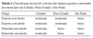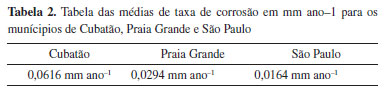 DISCUSSÃO O processo corrosivo é variável dependendo do meio em que está sofrendo a corrosão, dos compostos que a causam e as características únicas do metal. Sendo assim, a velocidade e a gravidade da corrosão tendem a mudar por fatores diretos, como poluentes e a maior umidade do ar, como ocorre em São Paulo e Cubatão, ou fatores indiretos, como a maresia, que, como já explicado, movimenta grandes quantias de cloreto de sódio, facilitando o processo corrosivo, como ocorre em Praia Grande e Cubatão.15 Com base nos dados disponibilizados pela NACE International,14 a taxa de corrosão é considerada baixa quando o valor é menor que 0,025 mm ano-1. Caso o valor esteja entre 0,025 e 0,125, a taxa de corrosão é considerada moderada e, por fim, caso o valor esteja acima de 0,125, a taxa de corrosão é considerada elevada. A partir dos dados obtidos através da Equação 4 e apresentados nas Figuras 9 e 10, obtém-se a Tabela 3.