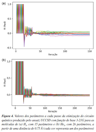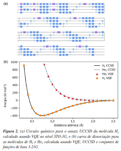 RESULTADOS E DISCUSSÃO O parâmetro mais importante para avaliar a possibilidade de executar um determinado cálculo é a profundidade do circuito quântico, que é o maior número total de operações ou portas aplicadas a cada qubit, considerando que algumas portas podem ser aplicadas em paralelo - ao mesmo tempo - enquanto outras necessitam esperar a finalização de um grupo de portas para serem aplicadas. A profundidade é igual ao número de portas quando nenhuma delas puder ser aplicada em paralelo, e diminui conforme a paralelização de um determinado circuito aumenta. Ela é determinada pelo ansatz escolhido, pelo número de spin orbitais e pelo computador quântico onde o circuito está sendo implementado. O número de spin orbitais, ao seu tempo, determina o número de qubits e é dado pela função de base. O aumento do número de spin orbitais para uma molécula estudada, gera um maior número de excitações possíveis, não só aprofundando o circuito como aumentando o número de Paulistrings a serem medidas. O workflow para o cálculo de VQE, utilizando o pacote Qiskit,49 da IBM, consiste na definição da molécula (geometria, carga e multiplicidade). Em seguida se faz um cálculo Hatree-Fock para se obter os parâmetros para o Hamiltoniano e para o ponto inicial da otimização. O ansatz é então construído a partir do número de spin orbitais e utilizando um esquema de mapeamento, no presente caso utilizando UCCSD e mapeamento de Jordan-Wigner, respectivamente. De posse dessas informações, o otimizador clássico é utilizado para minimizar o sistema de forma a se obter a energia eletrônica. O código utilizado durante o presente trabalho foi carregado na base de dados Zenodo,56 e também em repositório GitHub.57 Para a molécula de H2, usando os conjuntos base STO-3G, 3-21G e 6-31G,52 o circuito possui 134, 1.022 e 8.678 portas de um qubit e 56, 768 e 14.616 portas CNOT (operação que controla o estado de um qubit para o estado de outro qubit) de dois qubits, respectivamente. Tal elevado número de portas é necessário pois são elas que traduzem os operadores de excitação CC, os quais são gerados através do próprio Qiskit,49 para o circuito. É possível se construir circuitos menores utilizando outros ansatze, como o hardware efficient ansatz (HEA). Este para a molécula de H2O, num circuito estudado previamente de 12 qubits,58 apresentou uma profundidade de 96, enquanto o UCCSD foi de 477. No entanto, o número de parâmetros para HEA e UCCSD foram de 192 e 8, respectivamente. Além de um número de parâmetros significativamente maior, o que dificulta a convergência de forma acentuada, ansatzes do tipo HEA sofrem do problema conhecido como barren plateaus, que são regiões da SEP onde a variação de energia em função da variação dos parâmetros se aproxima de zero. O circuito para a base STO-3G pode ser visto na Figura 2a. O circuito para a base 3-21G é grande demais para ser apresentado nesse manuscrito, no entanto essa é a menor função de base que pode ser utilizada para a molécula de He2, pois as funções de base do tipo Slater (STO-nG) não geram orbitais virtuais para a excitação.