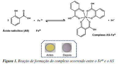 RESULTADOS E DISCUSSÃO A reação colorimétrica utilizada para a quantificação de ácido salicílico em papel é baseada na formação de um complexo de cor roxa após o contato entre o analito e íons Fe3+ em meio ácido, conforme apresentado na Figura 1. A seletividade desta reação foi avaliada previamente em outros trabalhos disponíveis na literatura.34,35 Verificou-se que a reação de formação do complexo entre FeIII e ácido salicílico não sofre interferência de outras espécies iônicas - tais como HgII, FeII, PbII, CdII, Na+, K+, Zn2+, Ca2+, Mg2+, Sn2+, NO3-, NO2-, CO32-, SCN- e oxalato - bem como de outras substâncias, como lactose, ácido cítrico, amido e glicose. Para a obtenção das melhores condições da realização da reação colorimétrica na superfície do papel, alguns parâmetros experimentais foram avaliados, tais como: tamanho do spot, concentração da solução de FeIII, estabilidade do produto formado e a ordem de adição dos reagentes. Estes parâmetros foram avaliados e otimizados para resultar em um sinal analítico de maior intensidade e uniformidade.