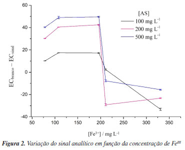 Avaliação da variação da concentração de ferro(III) Por fim, o último parâmetro da reação colorimétrica a ser otimizado foi a concentração da solução de FeIII, que foi avaliada na faixa de 80 a 330 mg L-1. As concentrações de ácido salicílico também foram preparadas em três níveis: 100, 300 e 500 mg L-1. Os valores de sinal analítico em função da concentração de FeIII estão apresentados a Figura 2. Um efeito significativo nos valores do sinal analítico com o aumento da concentração de FeIII é observado. O sinal atinge o máximo valor com 100 mg L-1, permanecendo constante em 200 mg L-1. Após esse valor, o sinal diminui de maneira considerável. Isto ocorre pelo fato de que o sinal analítico é obtido por meio da diferença entre a intensidade da escala de cinza do branco com o extraído da reação de FeIII com AS. Dessa forma, se o sinal analítico do branco for maior que o sinal analítico da reação, o valor é negativo. Concentrações elevadas de FeIII possuem colorações maiores e, consequentemente, o sinal do branco é maior. Por essa razão, a concentração de 100 mg L-1 de FeIII foi selecionada para o desenvolvimento das próximas etapas do trabalho.